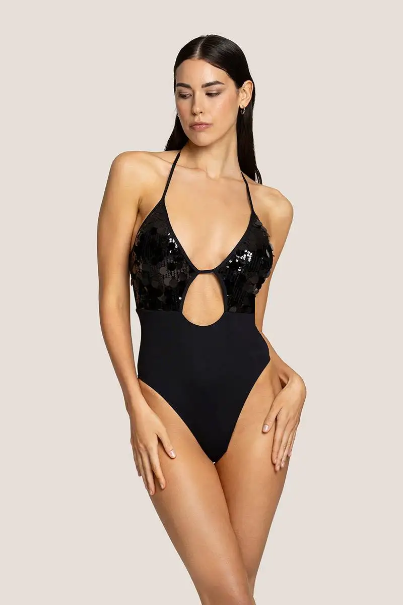 โ€“ Intero caratterizzato da ย scollatura centrale ed applicazione di paillettes tonde tono su tono