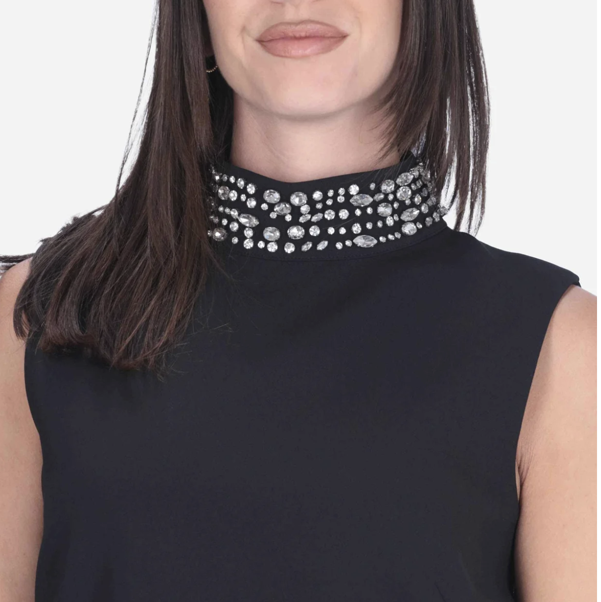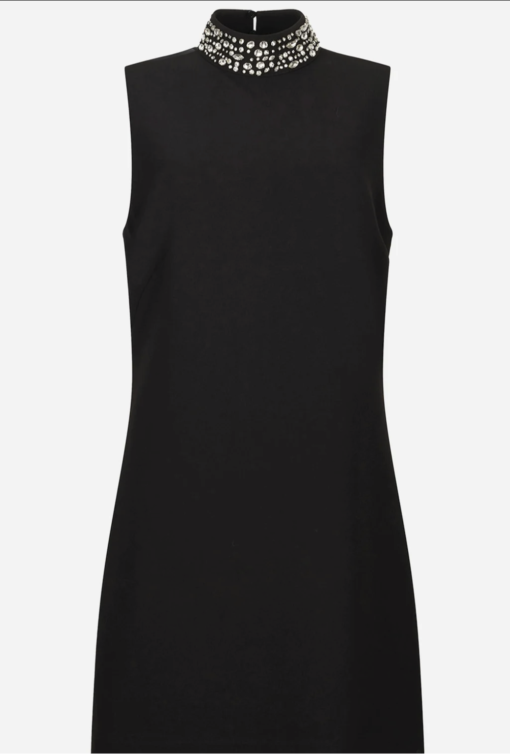 Presenta collo alto con strass applicati, chiusura con zip sul retro, semitrasparenza sul retro e fodera interna.
