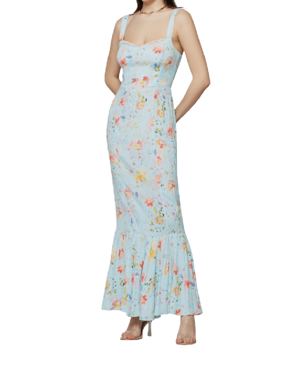 Abito celeste con fiori firmato Mar de Margaritas Abito celeste con fiori firmato Mar de Margaritas Denise – abito lungo avvitato con scollo a cuoreย in crรชpe. Spallina larga regolabile. Al fondo balza arriccita. Punto smoke sul retro. Composizione: 100% viscosa; Made in Italy; Codice:ย MMABW01171.ย