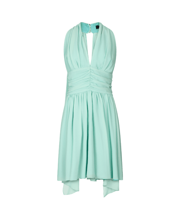 - Abito corto verde menta con drappeggio in georgette;