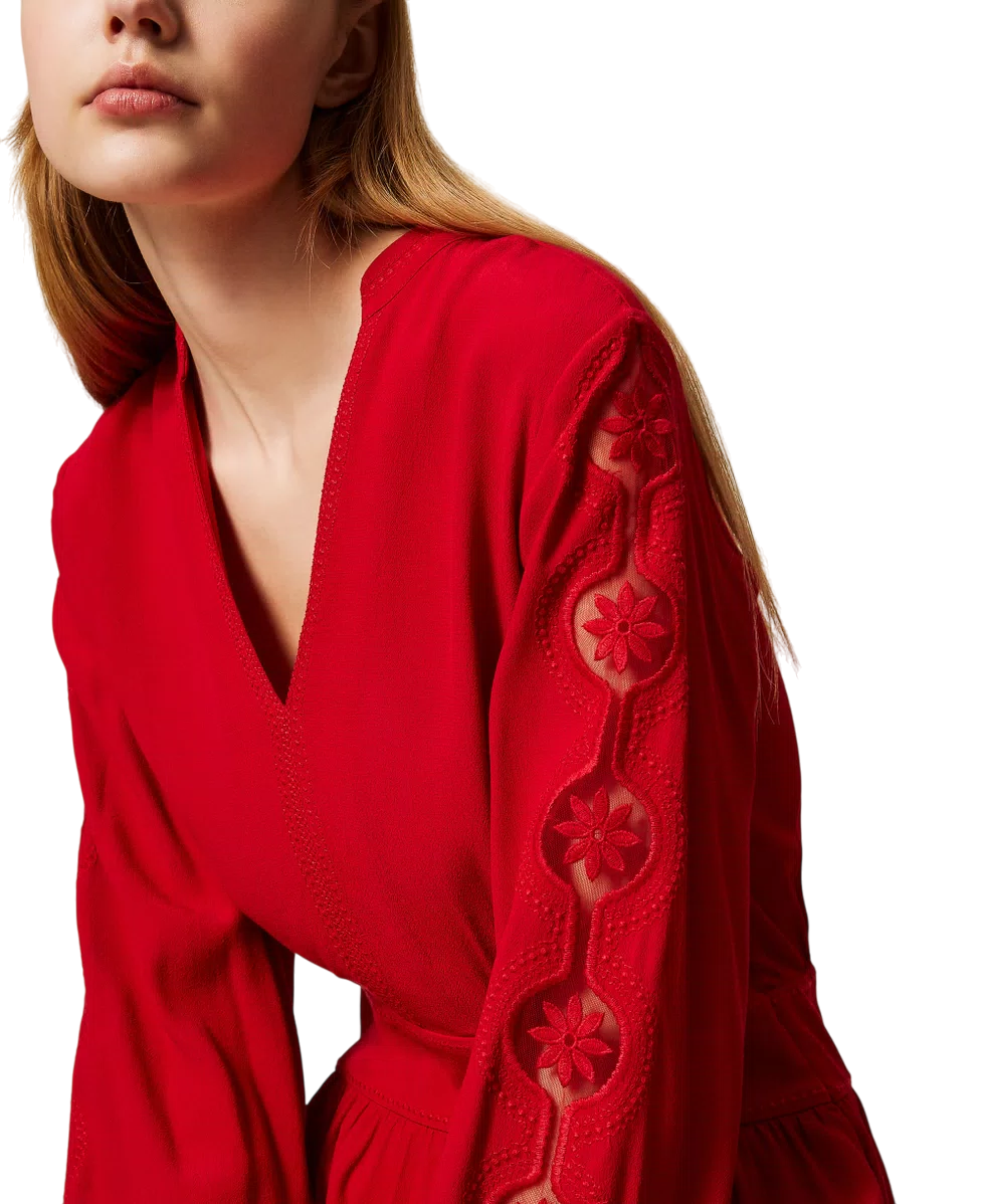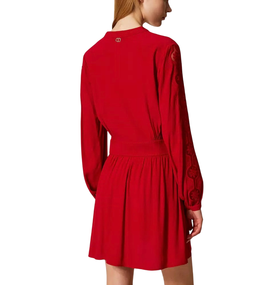 Abito corto in crêpe leggero di viscosa con ricamo geometrico su scollo, baschina e carré. Ha scollatura a V, maniche lunghe con ricamo floreale traforato, taglio baschina in vita sagomata da cui parte un’arricciatura che crea volume, chiusura con zip invisibile al fianco, linea morbida. Dettagli prodotto: Codice prodotto: 252TP2150 Rosso Veneziano Linea morbida 100% […]