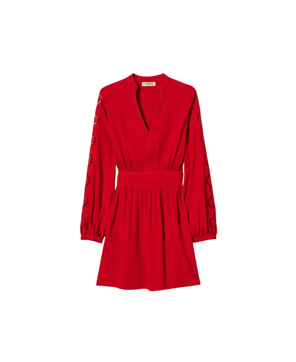 Abito corto in crêpe leggero di viscosa con ricamo geometrico su scollo, baschina e carré. Ha scollatura a V, maniche lunghe con ricamo floreale traforato, taglio baschina in vita sagomata da cui parte un’arricciatura che crea volume, chiusura con zip invisibile al fianco, linea morbida.