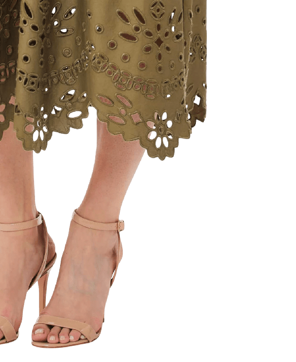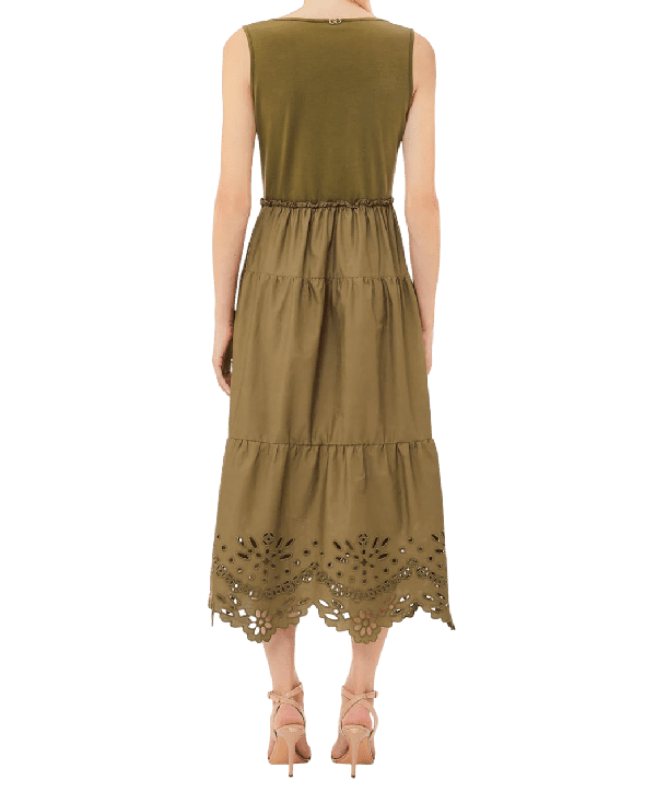 Abito in cotone con ricami firmato Liu Jo Abito in cotone con ricami firmato Liu Jo Abito midi in jersey e popeline di cotone; Ricami al fondo; Scollo rotondo; Sorretto da spalline larghe; Logo in metallo sul retro; Elastico in vita; Gonna a balze; Made in Italy.