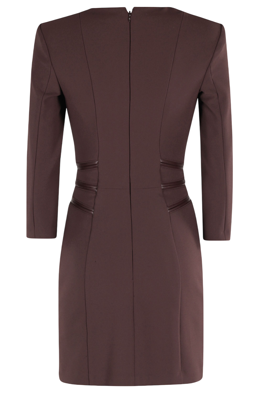 Abito in doppio crêpe dalla vestibilità aderente. Dalla linea essenziale e sofisticata, ha maniche ¾ e si distingue per lo scollo con dettaglio funzionale di zip e tirazip con logo, replicato sulla vita come elemento decorativo. I filetti in tono esaltano il punto vita con un andamento diagonale.