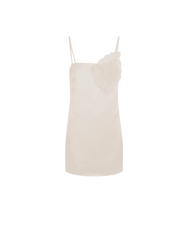 Abito in duchesse. Il vestito ha spalline sottili, gonna mini e taglio a V sulla schiena.