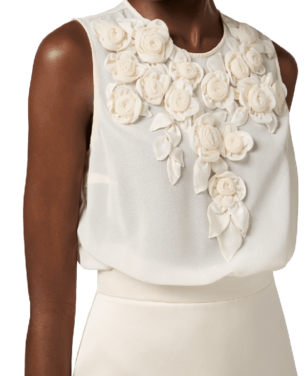 Il vestito si distingue per le rose in tessuto crรชponne e in raso sul busto, ricamate rigorosamente a mano.