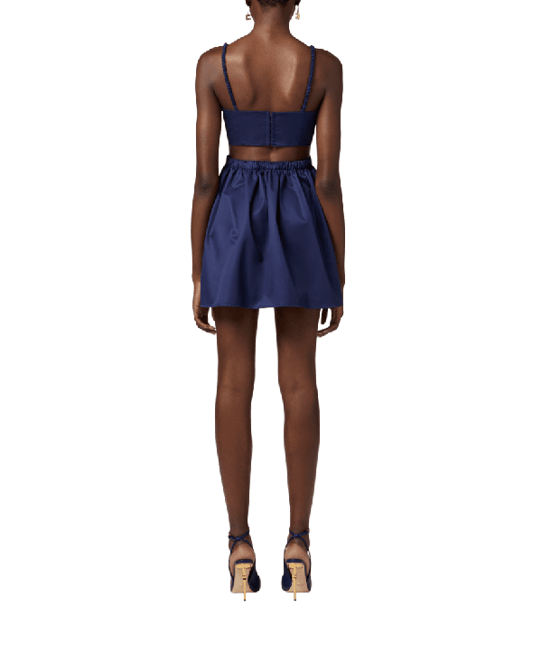 Il dettaglio di stile รจ il fiocco in tessuto coordinato sul busto che aggiunge movimento, insieme alla gonna mini finemente arricciata.