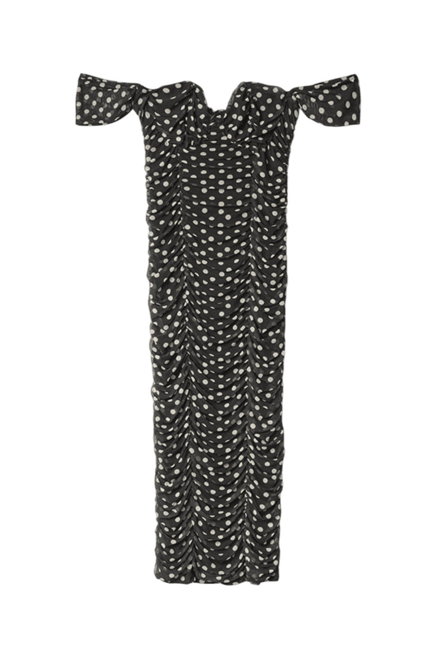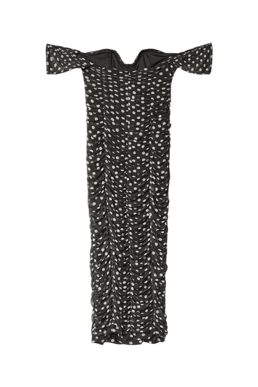 Dettagli prodotto Evita – tubino in tulle con arricciature e scollo a cuore Colore: Pois noir Composizione: 95% poliestere 5% elastan stretch La modella indossa la taglia S Altezza modella: 1.75 cm Made in Italy Mar de Margaritas โข SS25 Collection