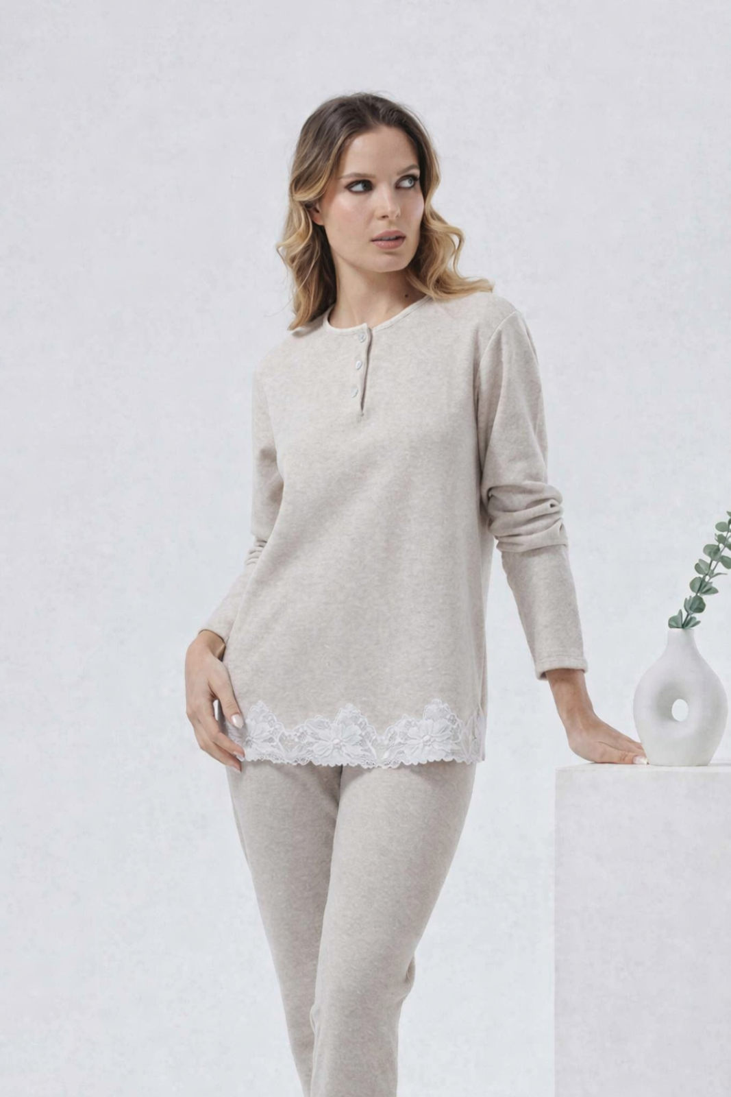 Pigiama serafino donna Andra in punto Milano con pizzo smerlato. Caldo, morbido ed elegante, ideale per il relax quotidiano.