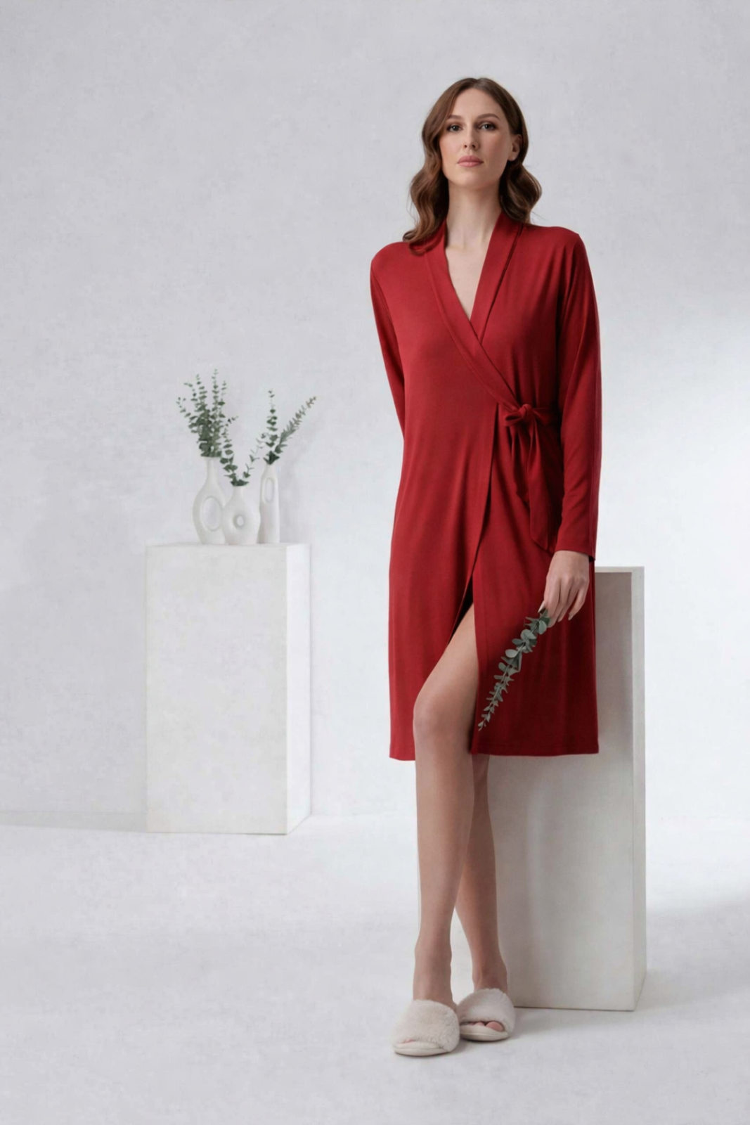 Il design incrociato con chiusura a cintura valorizza la silhouette in modo naturale, adattandosi armoniosamente alle forme senza costrizioni. La linea pulita e raffinata rende questa vestaglia donna in viscosa un capo versatile, perfetto da indossare sopra pigiami o camicie da notte coordinate.