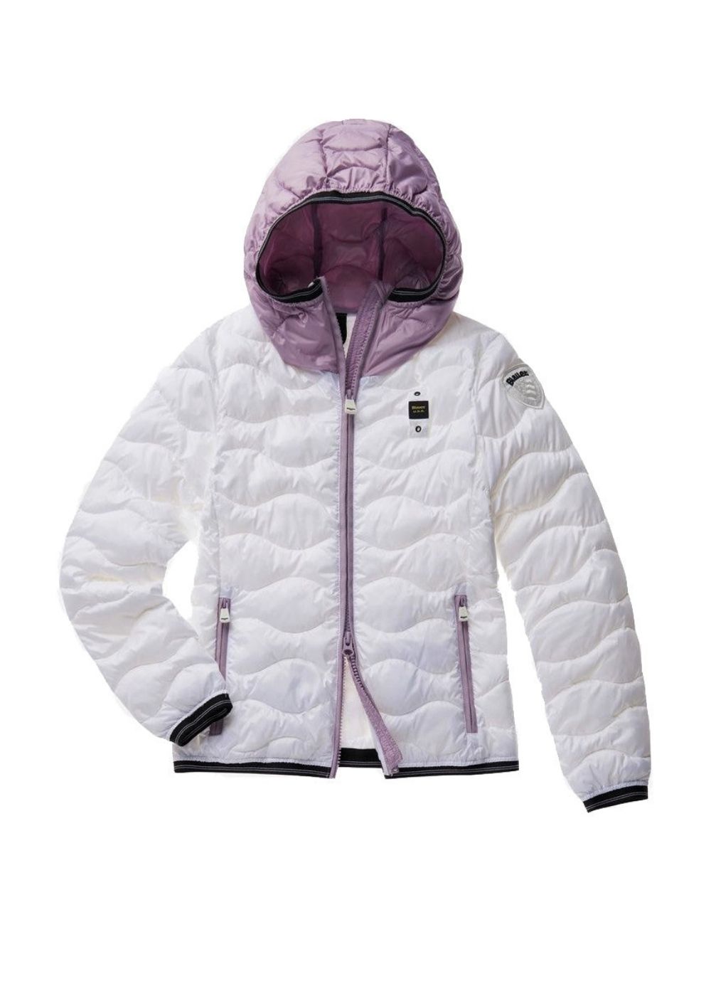 - Piumino impacchettabile 100% nylon con imbottitura Repreve e sacchetto contenitivo logato Blauer per un compatto trasporto.