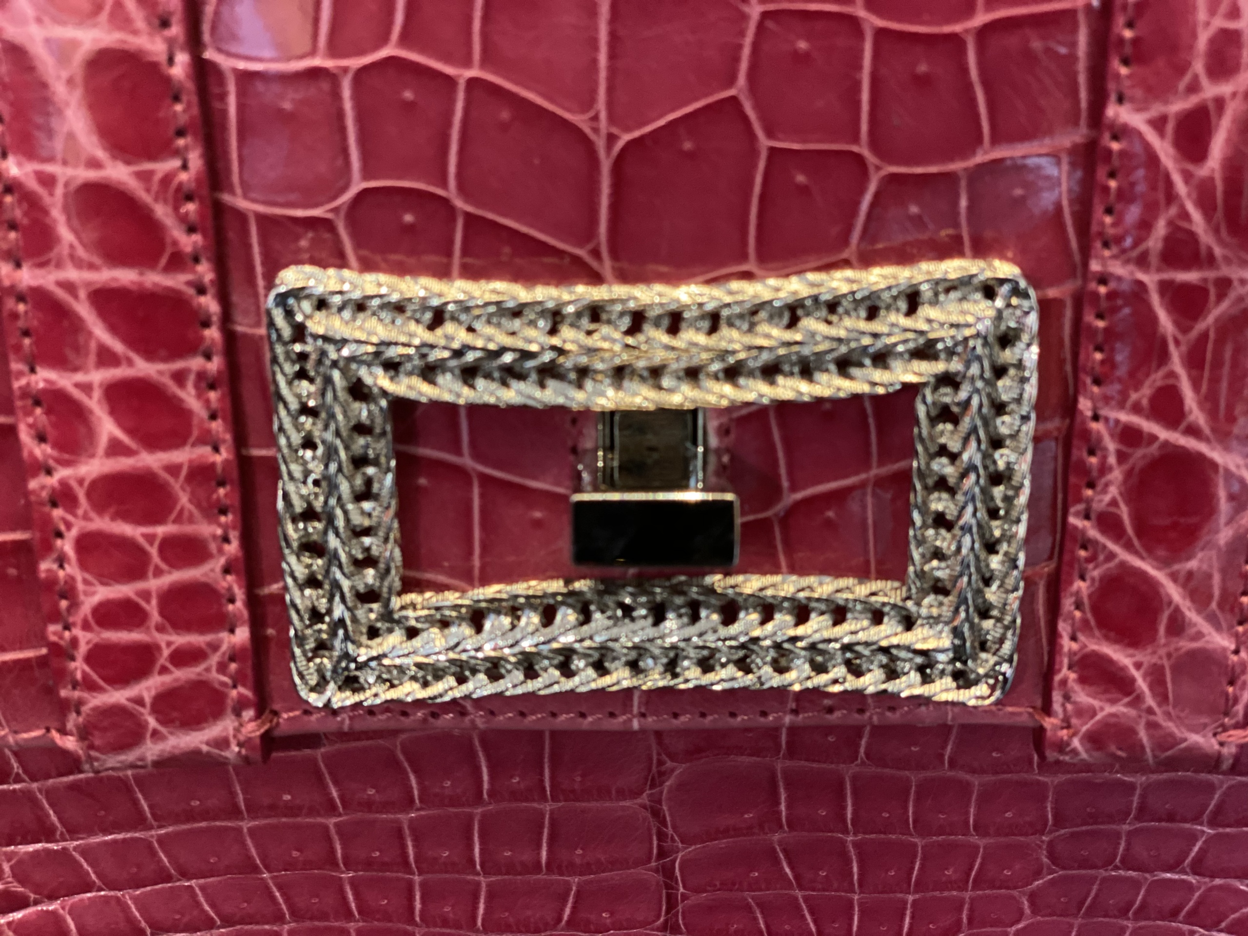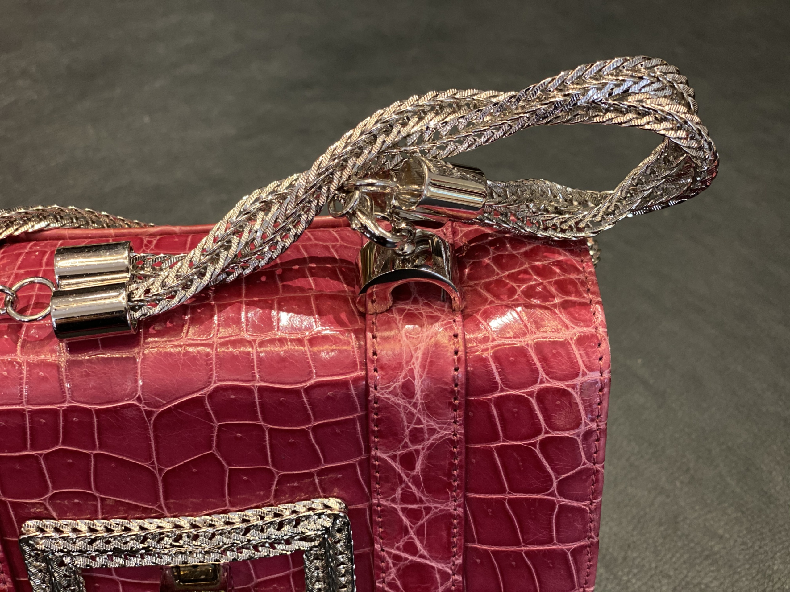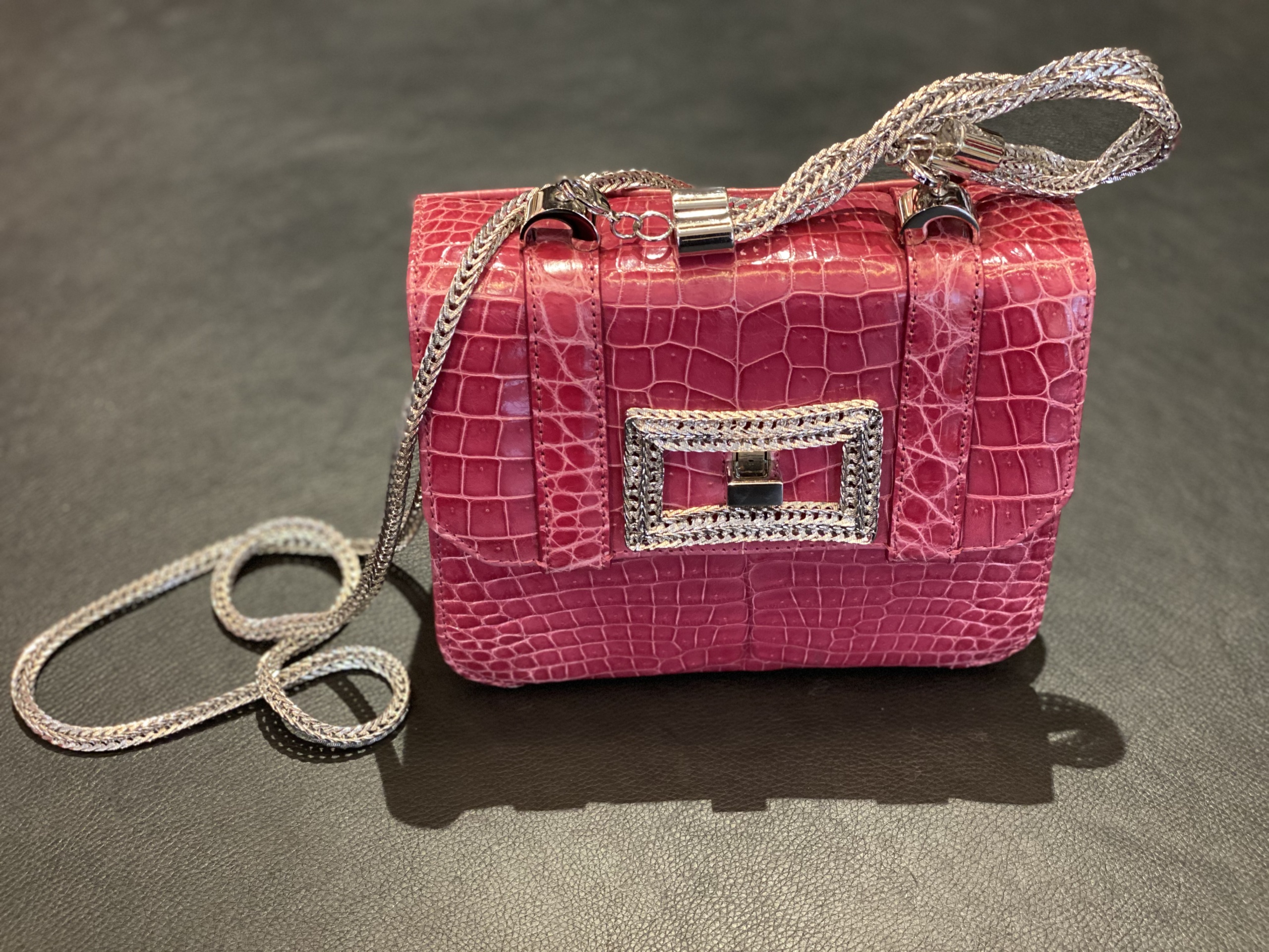 BORSA IN VERA PELLE CON CHIUSURA GIOIELLO IN METALLO, MANICO SEMPRE IN METALLO STACCABILE COME ANCHE LA TRACOLLA.