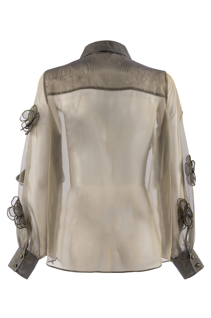 Camicia in organza leggera e trasparente, impreziosita da applicazioni floreali tridimensionali. Da abbinare a pantaloni a vita alta o gonne.