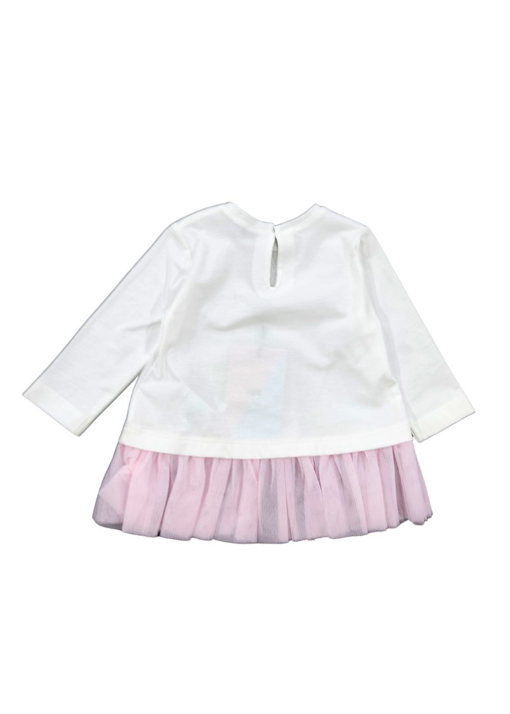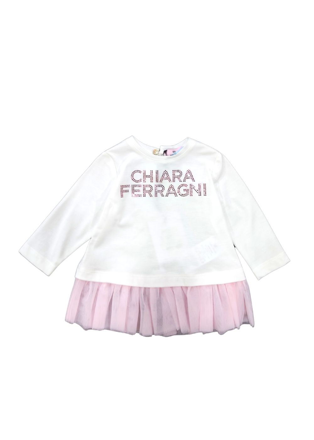 La t-shirt logata ha una linea leggermente a trapezio e un’inaspettata balza in tulle DETTAGLI: Chiara Ferragni bebรจ jersey e tulle ricamo CHIARA FERRAGNI volant in tulle COMPOSIZIONE: 95% cotone; 5% elastan