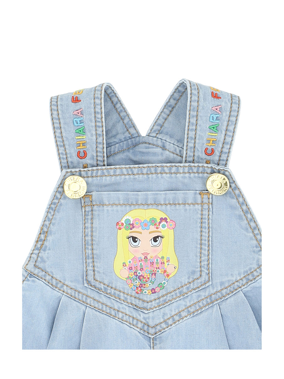 Salopette in tencel con bratelle e stampa Chiara Ferragni mascotte.