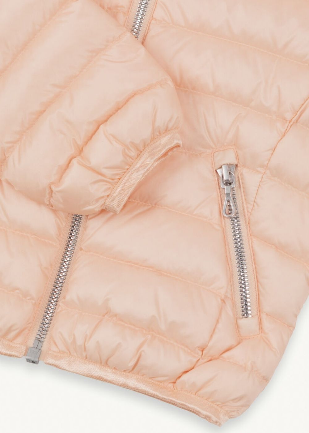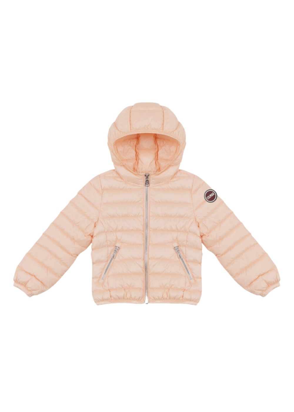 Giacca baby con cappuccio, realizzata in tessuto ultraleggero riciclato. Imbottita in leggera piuma naturale, รจ un capo iconico Colmar Originals, proposto in nuove nuances per la stagione primaverile.