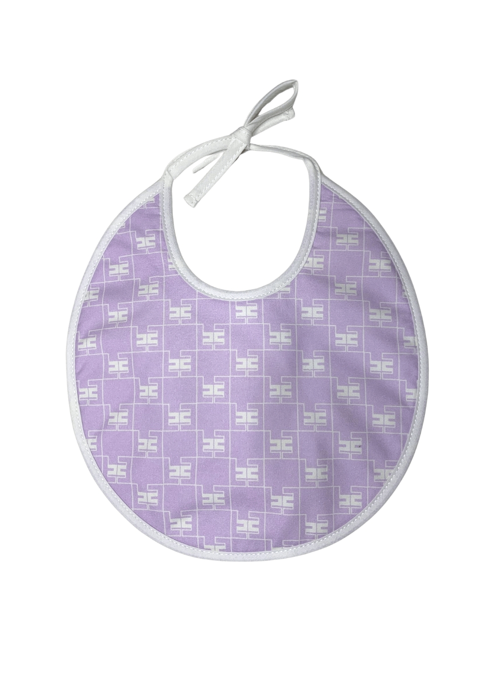 Bavaglino con effetto a contrasto in 100% cotone. Stampa loggata bordo a contrasto chiusura posteriore con nodo 100%cotone colore lilla
