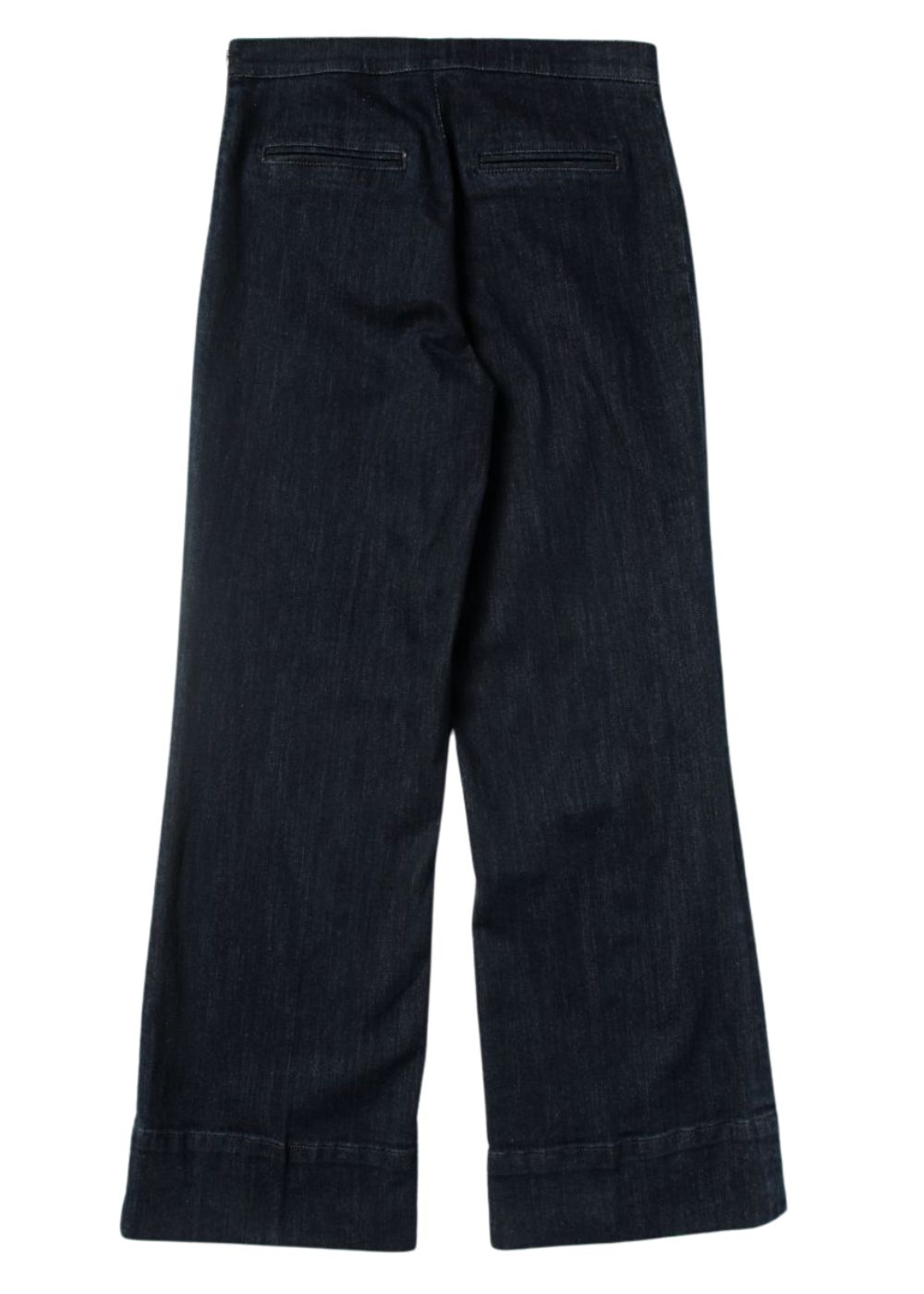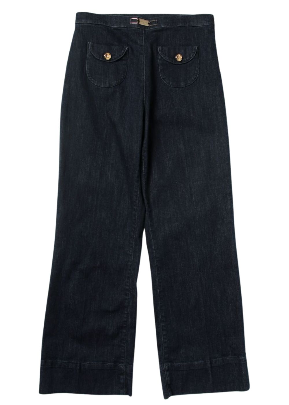 โข Denim di cotone โข Vita alta โข Tasche a toppa con bottoni gioiello โข Gamba ampia โข Chiusura laterale