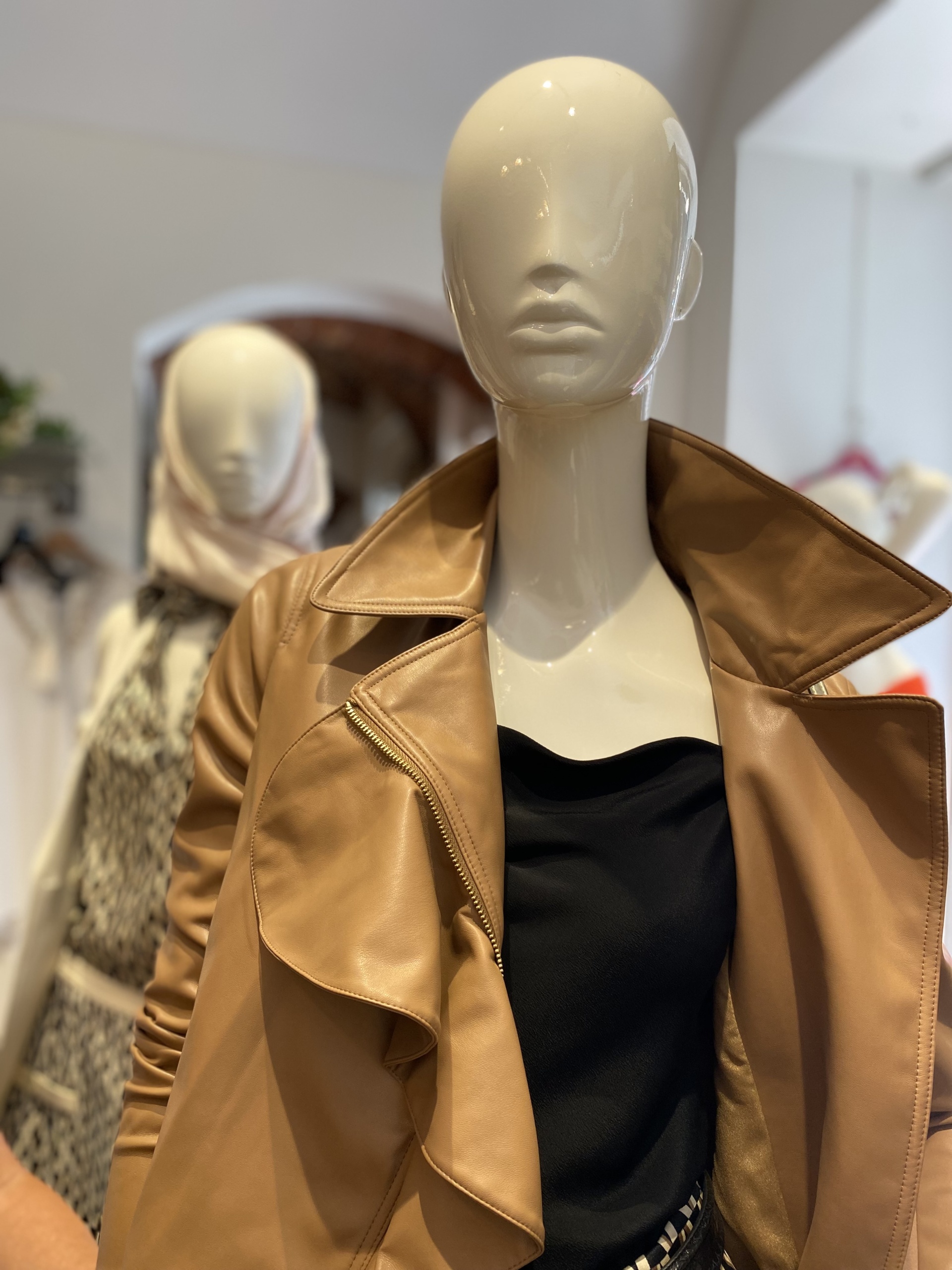 GIACCA CHIODO EFFETTO PELLE CON INSERTI IN PUNTO MILANO, VOLANT SU UN LATO DELL’APERTURA. DISPONIBILE IN DUE VARIANTI COLORE.
