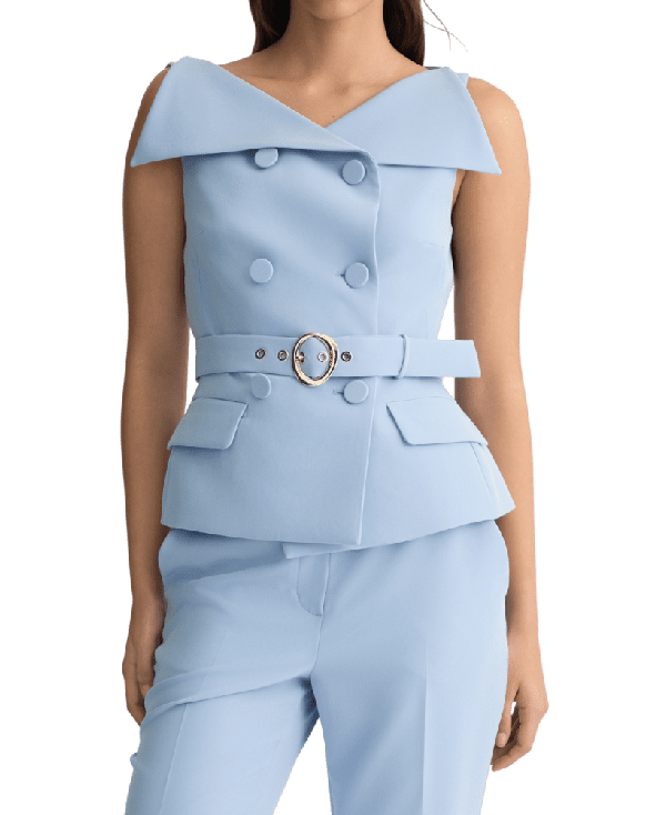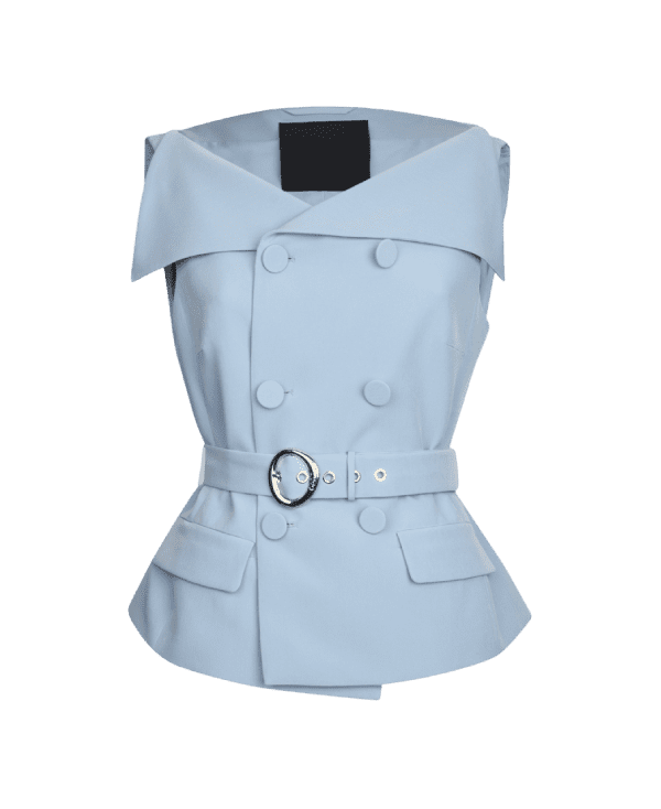 Questo capo reinterpreta il classico gilet con un twist super glam. Realizzato in tessuto tecnico stretch avvolge la silhouette con una sottile cintura ton sur ton.