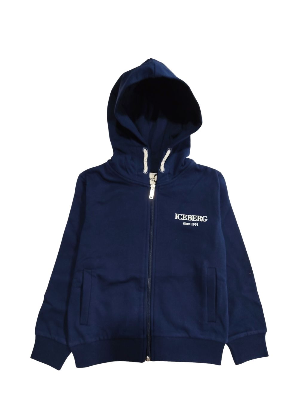 DETTAGLI: felpa blu in cotone cappuccio regolabile scritta “ICEBERG since 1974” sul petto e nella parte posteriore linguetta della zip di colore bianco vestibilitร regolare lunghezza media COMPOSIZIONE: 98% Cotone; 2% Elastan