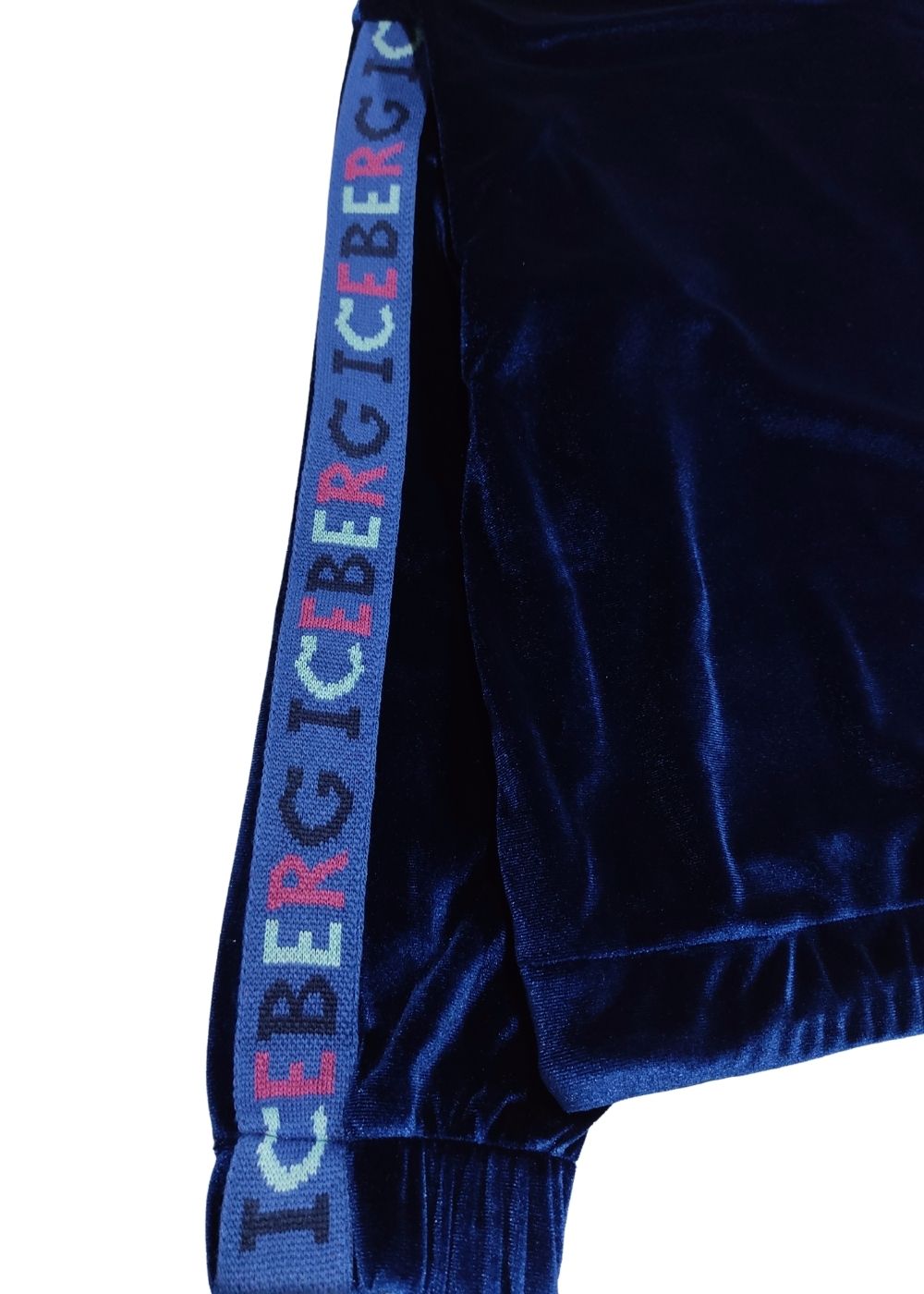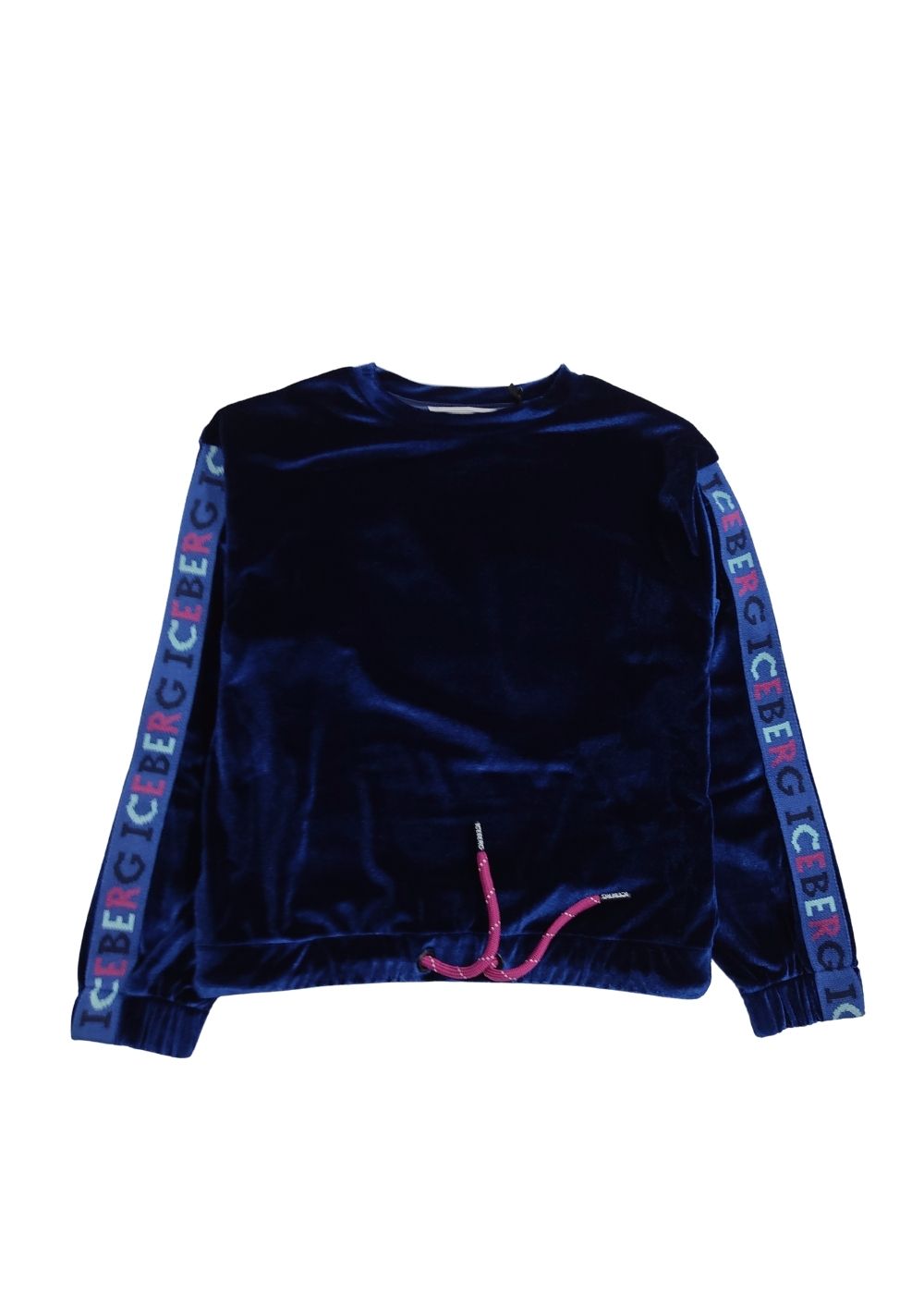DETTAGLI: felpa blu in ciniglia girocollo scritta “ICEBERG” lungo le maniche scritta multicolore coulisse in vita con lacci rosa vestibilitร regolare lunghezza media COMPOSIZIONE: 40% Modal, 40% Cotone, 15% Poliestere, 5% Elastan