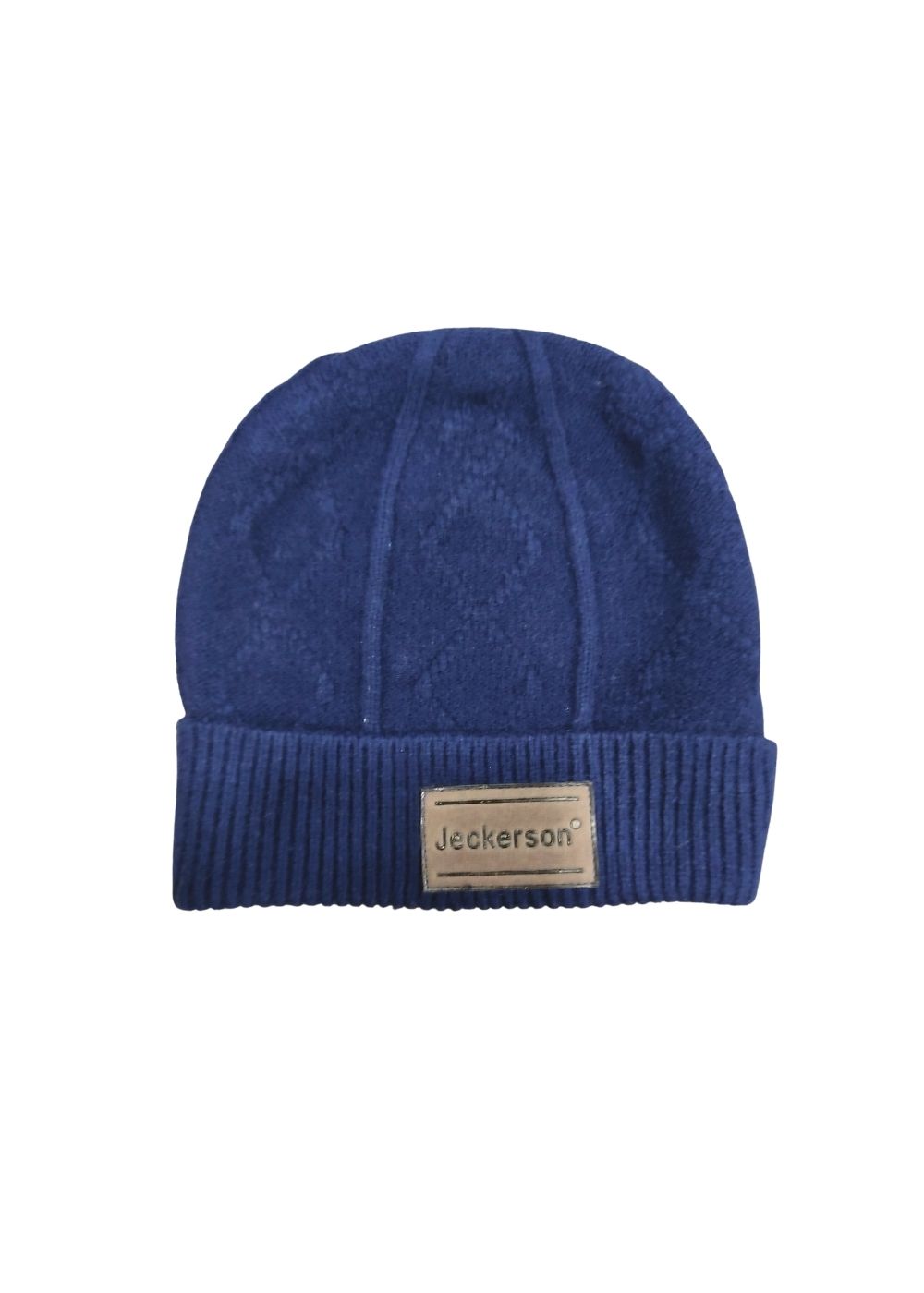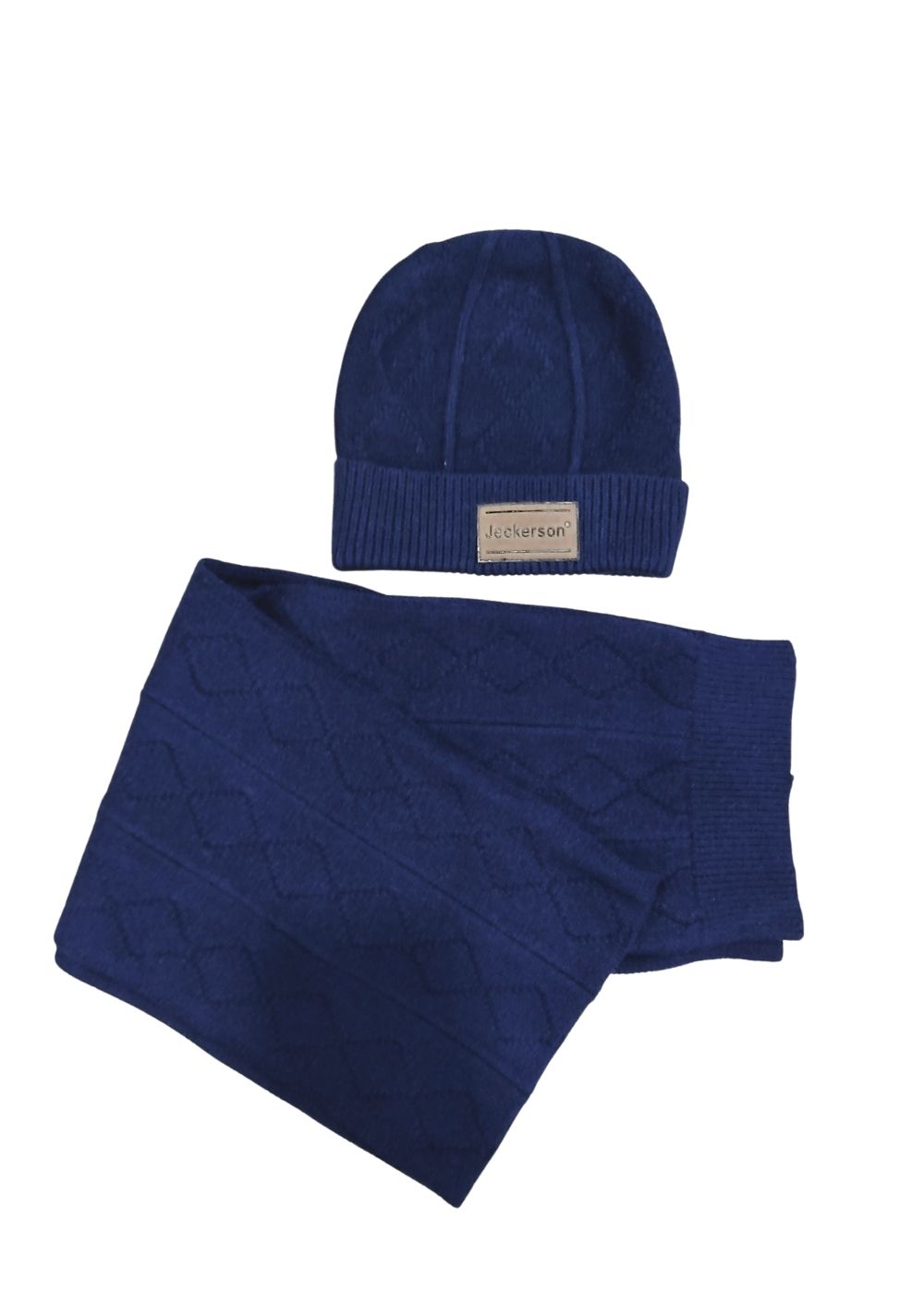 cappello e sciarpa da bambino colore blu tinta unita scritta “jeckerson” sul cappello ideali per le giornate piรน fredde