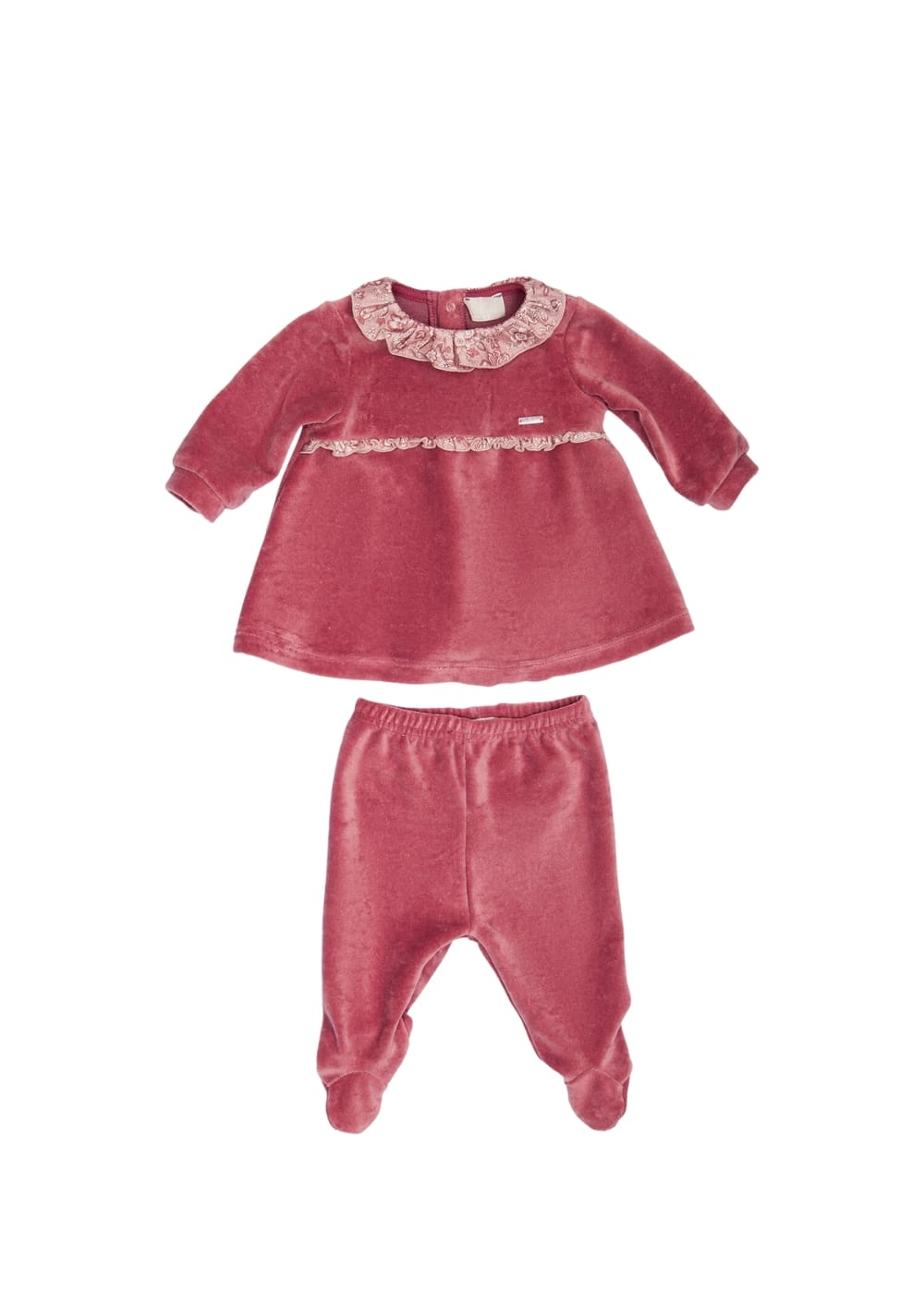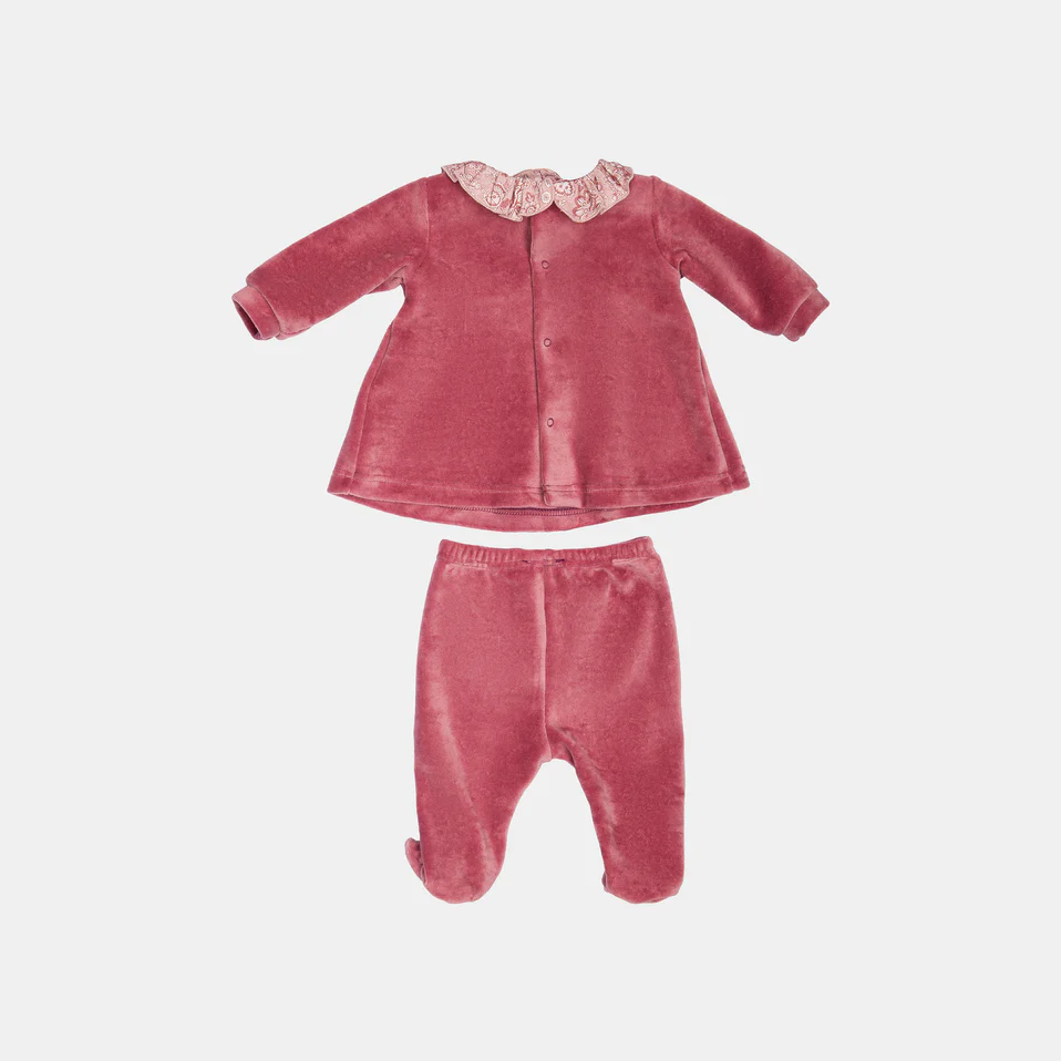 Completo clinica in ciniglia da neonata con colletto in stile vittoriano Rouches sui fianchi con motivo floreale Bottoncini sul retro per facilitare la chiusura 80% Cotone – 20% Poliestere