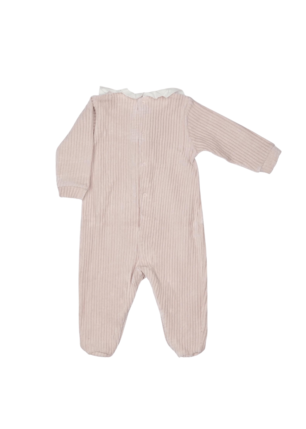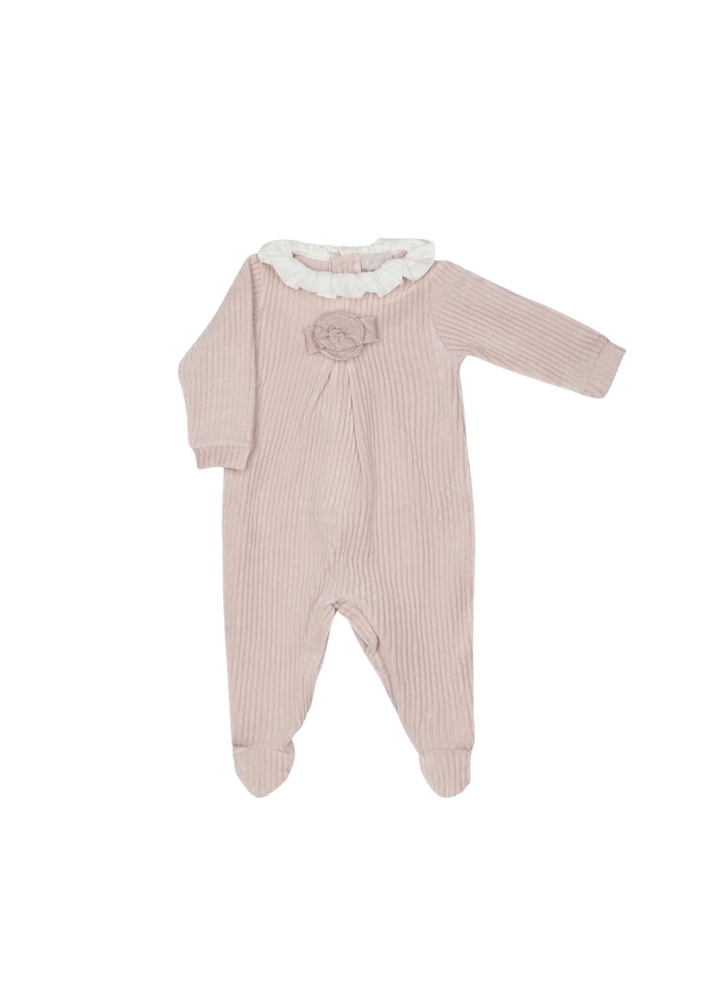 Tutina in morbida ciniglia Dolce rouche al collo Piegone fermato da un delizioso fiore in tessuto sul davanti Abbottonatura inferiore e posteriore 80%COTONE 15%POLIESTERE 5%LYCRA