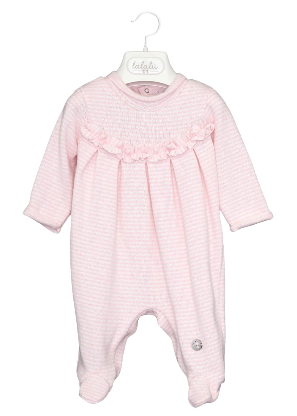 Tutina neonato bambina Lalalù in maglia, a righe, con applicazione rouge e arricciatura sotto il petto.Chiusura con bottoni. Autunno Inverno 21 Composizione: 70%CO 20%PC 3%VI 3%PL 2%PA 2%EA