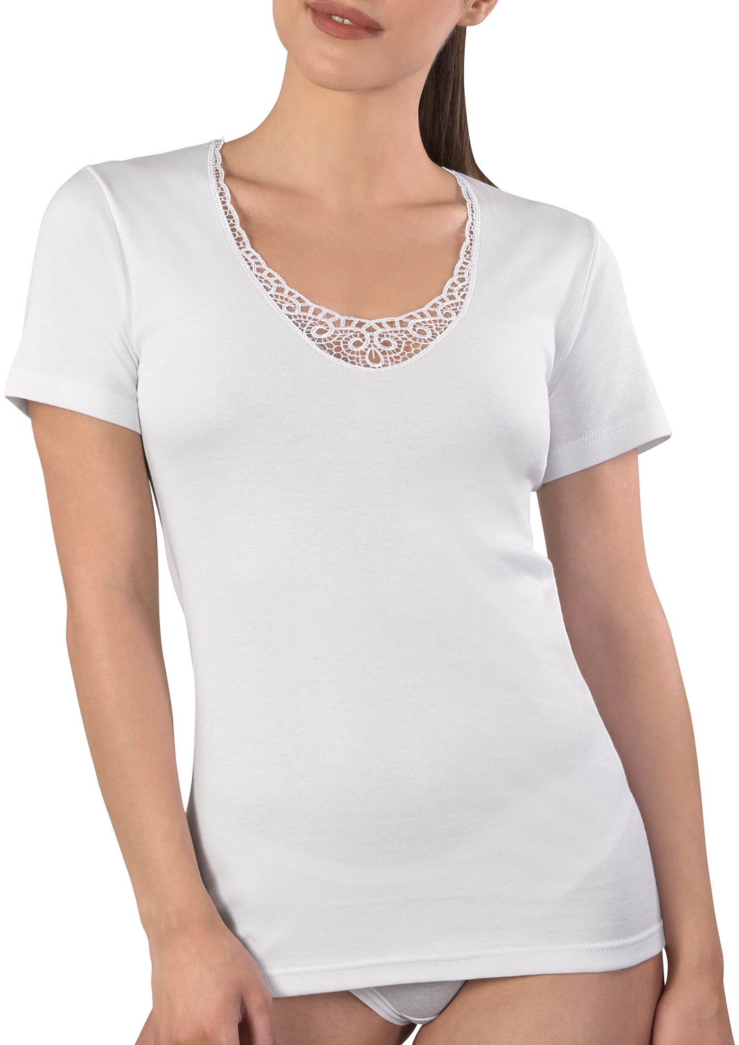 Maglia a maniche corte in cotone caldo interlock, decorata con un raffinato pizzo sullo scollo. MATERIALE: CALDO COTONE COMPOSIZIONE: 100% COTONE
