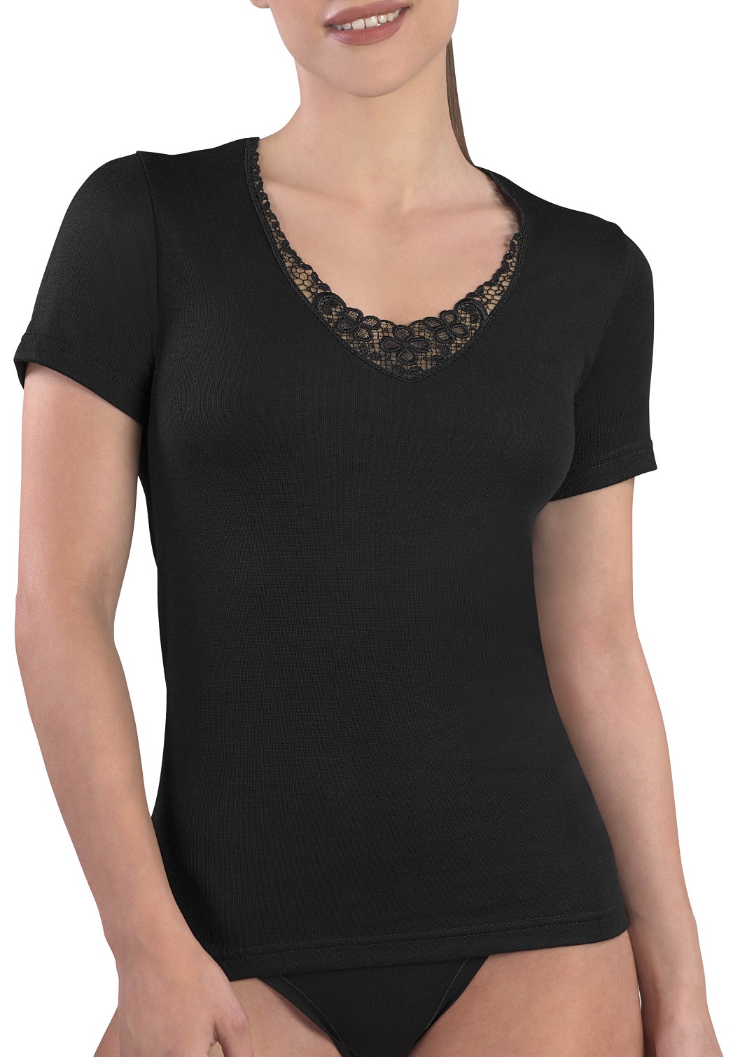 Questa maglia a maniche corte รจ realizzata in cotone caldo interlock, un tessuto morbido e resistente con struttura a doppio strato che offre una sensazione di comfort avvolgente e una superficie liscia. Il design classico รจ arricchito da un dettaglio in pizzo sullo scollo, che dona un tocco di femminilitร ed eleganza. Disponibile nelle colorazioni bianco e nero, si presta perfettamente sia come capo intimo per la stagione fredda che come elemento versatile per outfit sofisticati. Perfetta per chi cerca comfort e stile in un unico capo.