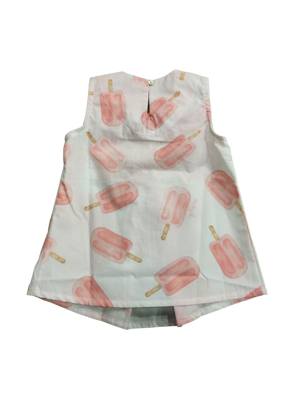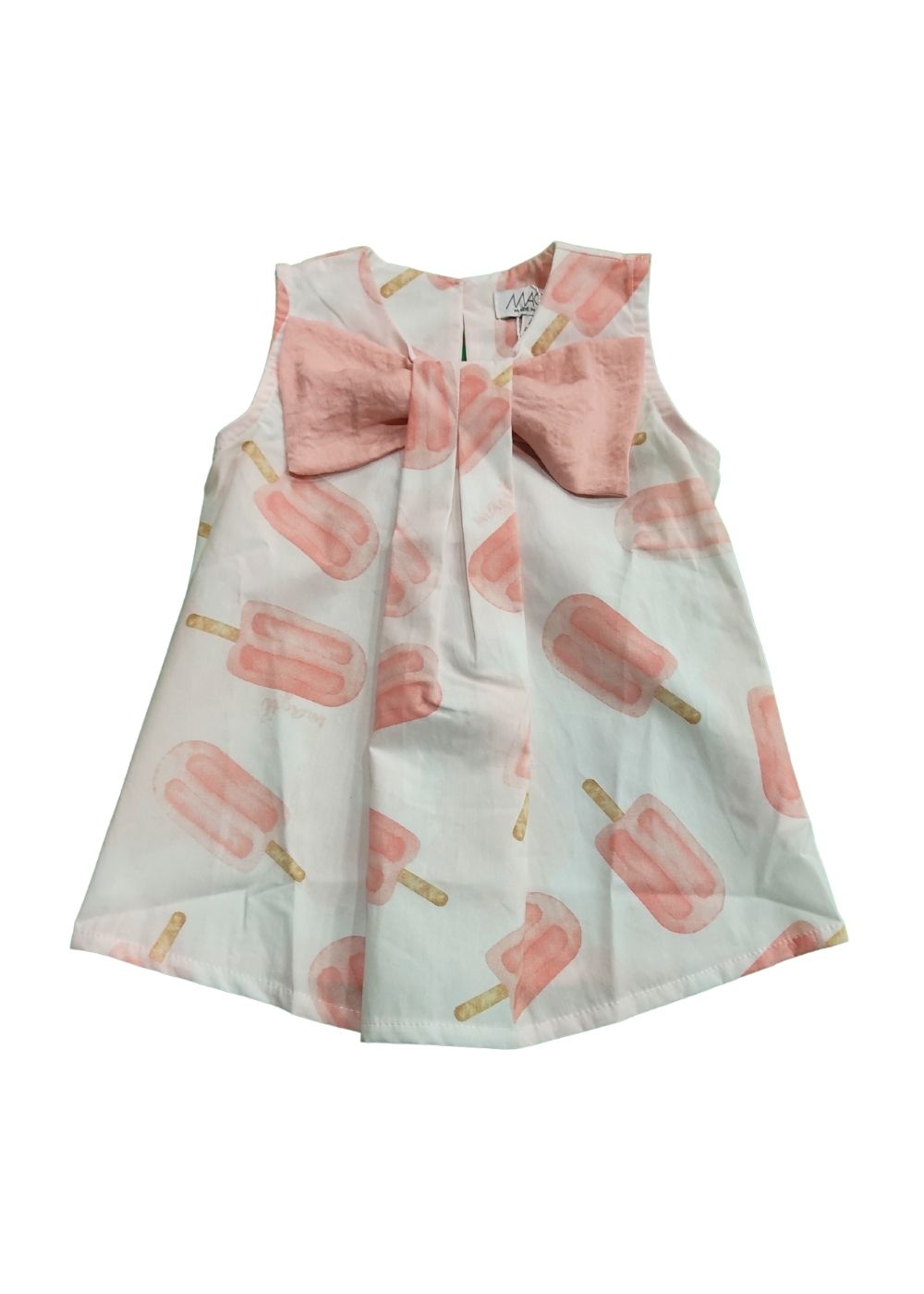 Top stampa ghiaccioli smanicato Dettaglio maxi fiocco frontale in mano seta Chiusura sul retro con bottoncino in madreperla Composizione: 100%CO Dettaglio: 100%PL
