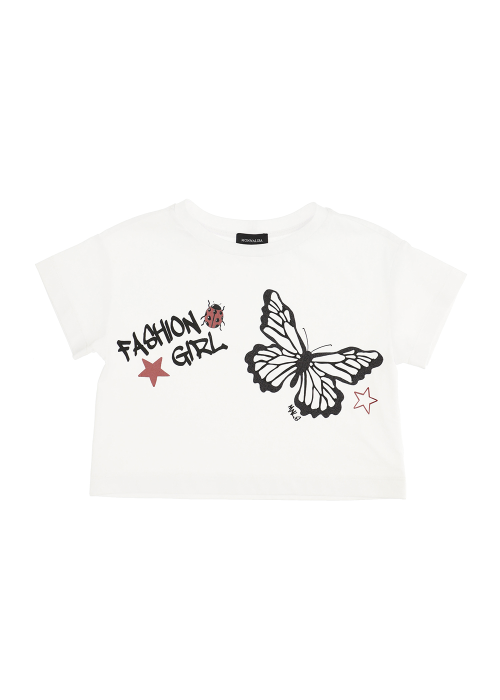 La t-shirt linea a scatola corta ha una divertente stampa lettering e una farfalla. DETTAGLI: jersey cotone scollo rotondo riportato scritta stampata con farfalle maniche corte impunture a due aghi COMPOSIZIONE: Tessuto principale: 100% Cotone Made in: Italy