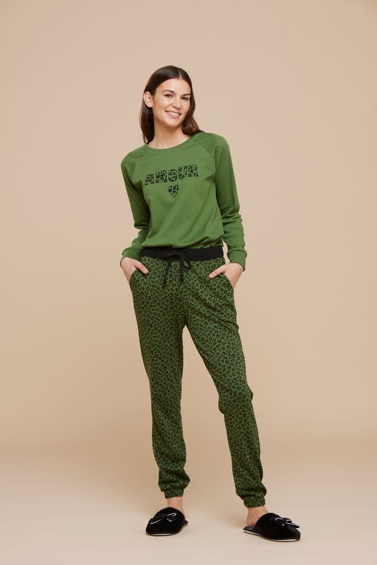 Pigiama da donna in cotone felpato. La maglia presenta eleganti polsini e un taglio raglan che assicura una vestibilitร comoda e alla moda. La stampa “amour” in una fantasia maculata aggiunge un tocco di glamour e romanticismo al capo. Il pantalone, dotato di pratiche tasche e anch’esso con polsini, richiama la fantasia della scritta presente sulla maglia, creando un coordinato armonioso e accattivante. Per un tocco di raffinatezza in piรน, il pantalone รจ impreziosito da un elegante coulisse in vita che permette di regolare la vestibilitร secondo le proprie preferenze.
