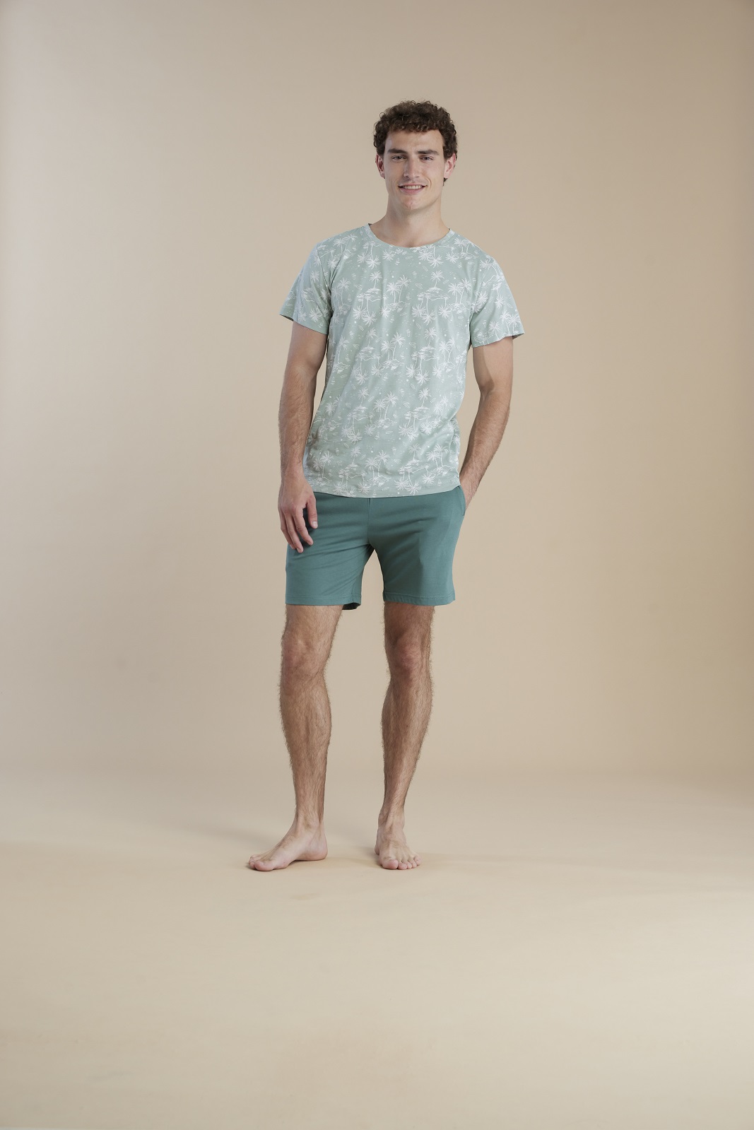 Realizzato in 100% cotone leggero e traspirante, questo pigiama uomo estivo Noidinotte รจ lโideale per affrontare le notti calde con comoditร e freschezza. Il design con maglietta a girocollo e stampa all-over di palme su fondo verde evoca atmosfere vacanziere, perfetto per chi ama uno stile rilassato ma curato nei dettagli.