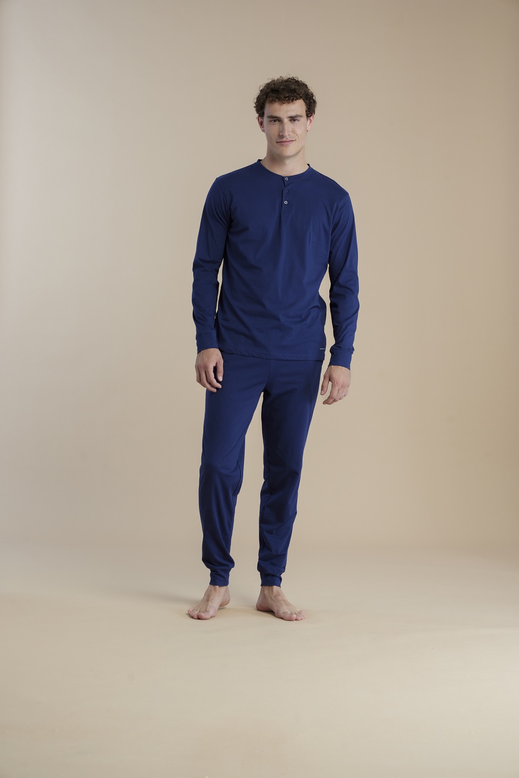 La maglia a maniche lunghe presenta uno scollo a tre bottoni e una linea pulita in tinta unita blu navy, perfetta per uno stile sobrio e rilassato. Il pantalone lungo abbinato, con polsini alla caviglia, garantisce una vestibilitร comoda e un look ordinato anche durante il riposo.