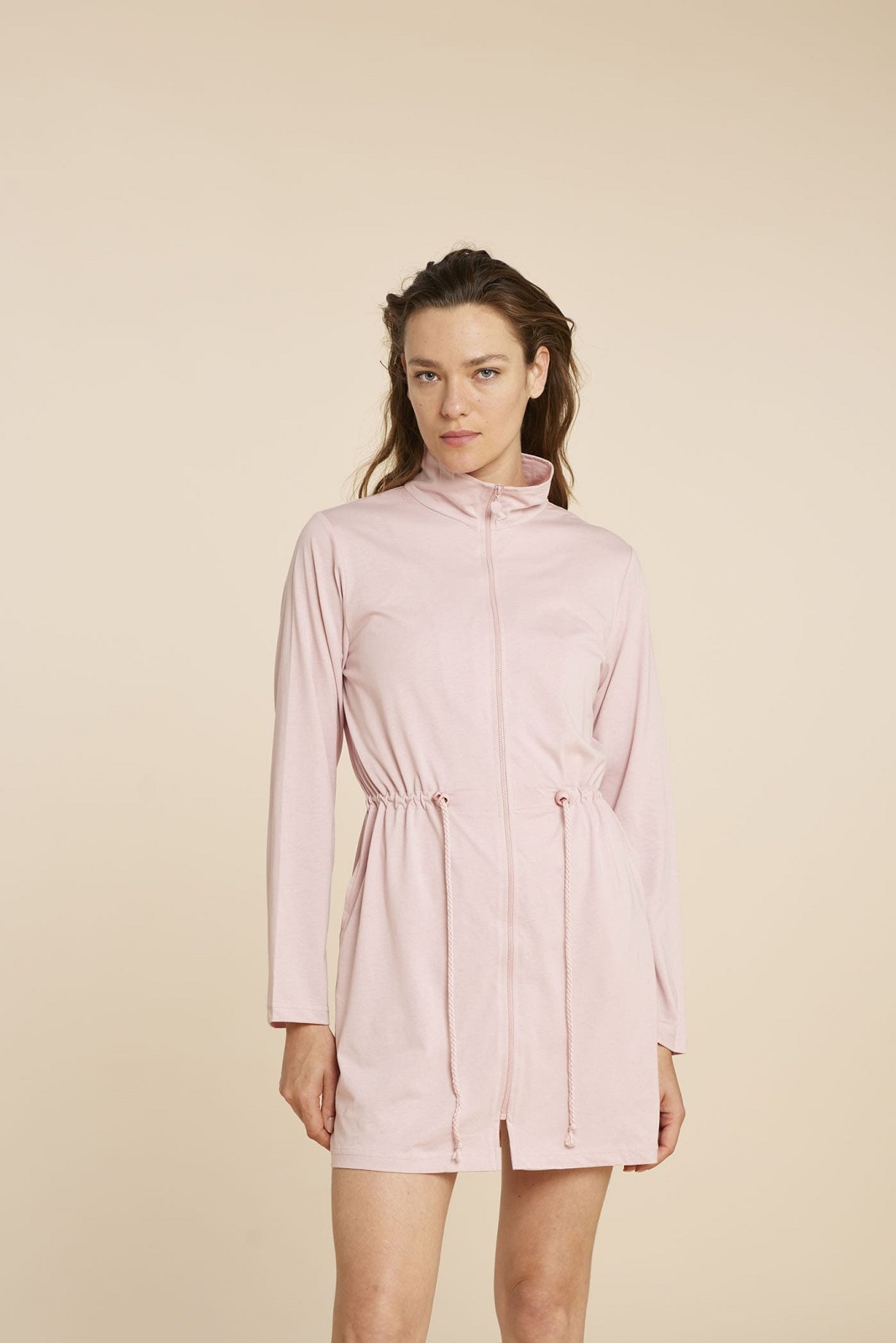 Vestaglia donna manica lunga in cotone, con coulisse in vita regolabile e chiusura a zip.