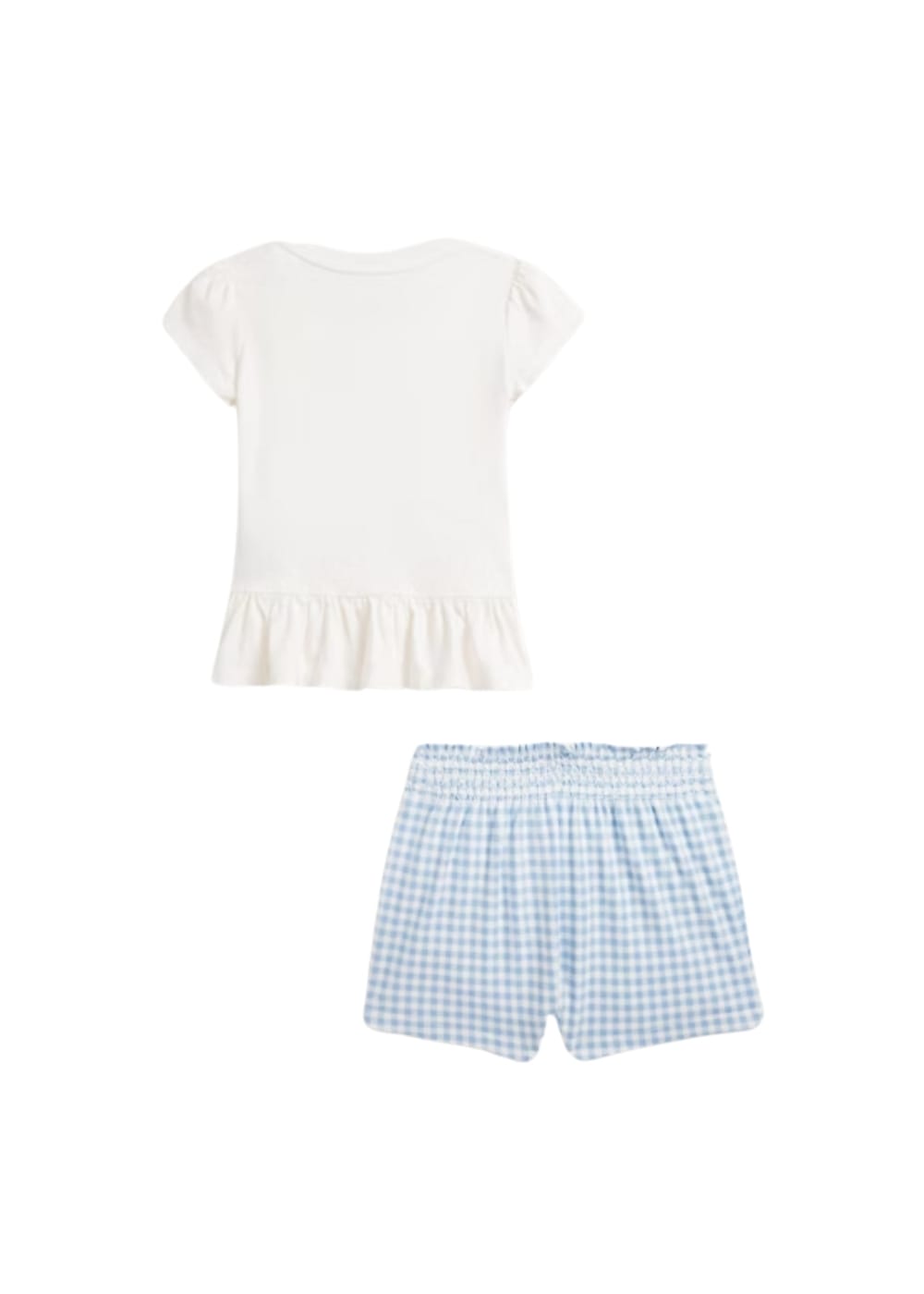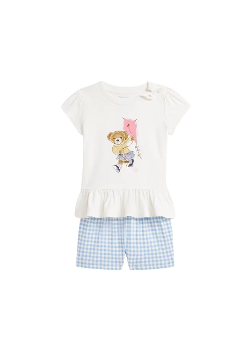 Maglietta: Girocollo Chiusura a due bottoni sulla spalla sinistra Maniche corte a sbuffo Polo Bear e monogramma “RL” stampati al centro sul davanti Orlo a peplo Culotte: esclusivo pony ricamato sul fianco destro Fascia in vita a punto smock con finitura di volant 100% cotone lavabile in lavatrice