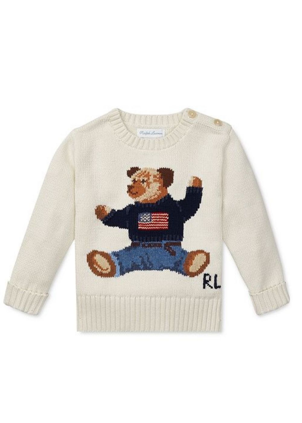 Su questo comodo capo, la nostra iconica mascotte in maglia a intarsi sfoggia un outfit di ispirazione western, inconfondibilmente RL. Il modello รจ rifinito con adorabili bottoni spaiati sulla spalla.
