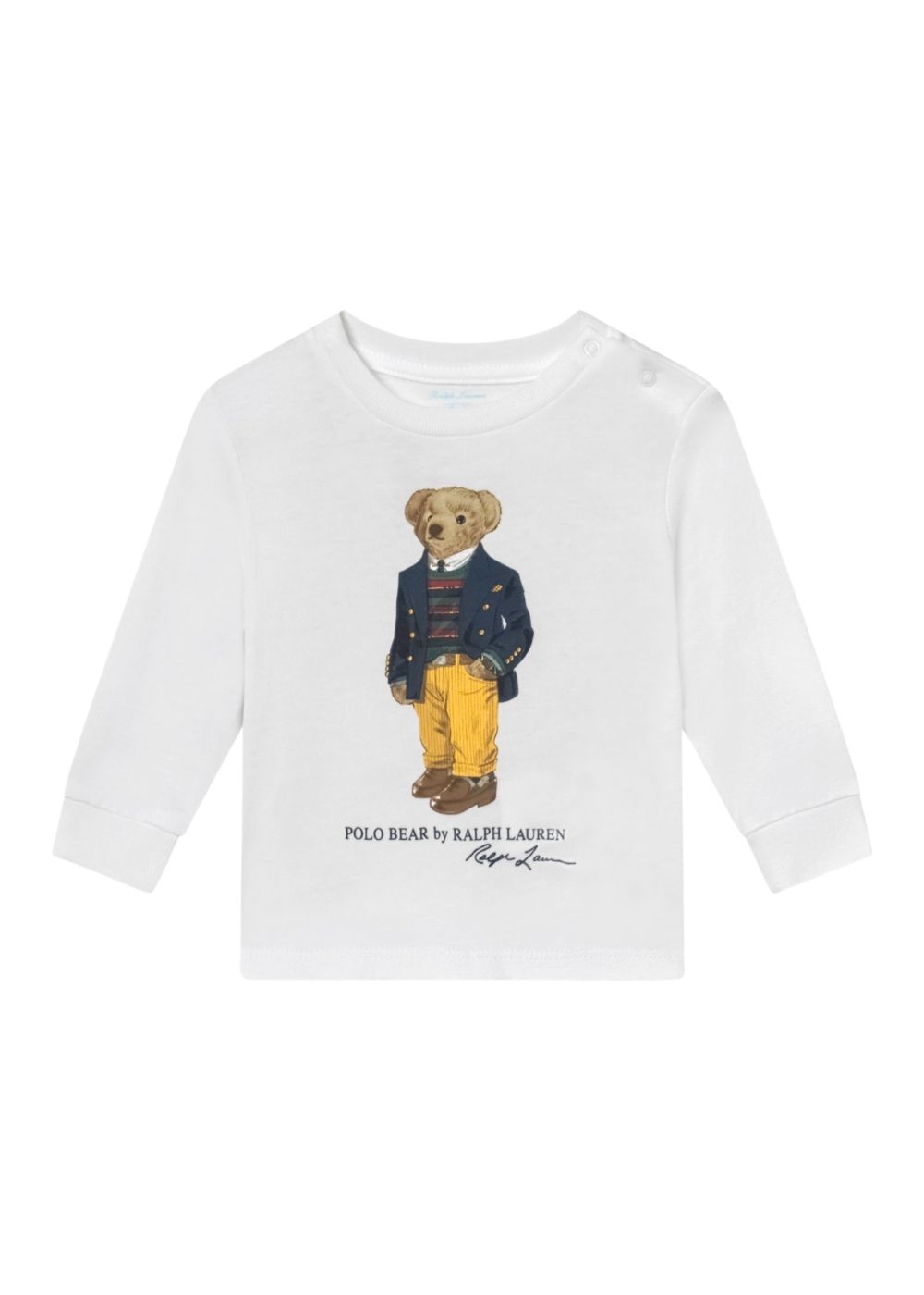 Su questa maglietta in jersey di cotone, la mascotte di Ralph Lauren indossa pantaloni gialli e una giacca blu stile vintage. Dettagli Cotone. Lavabile in lavatrice. Vestibilitร  regolare Scollo arrotondato. Bottoncini sul collo Maniche lunghe. Polo Bear e scritte “Polo Bear by Ralph Lauren” e “Ralph Lauren” stampati al centro sul davanti. Importato.