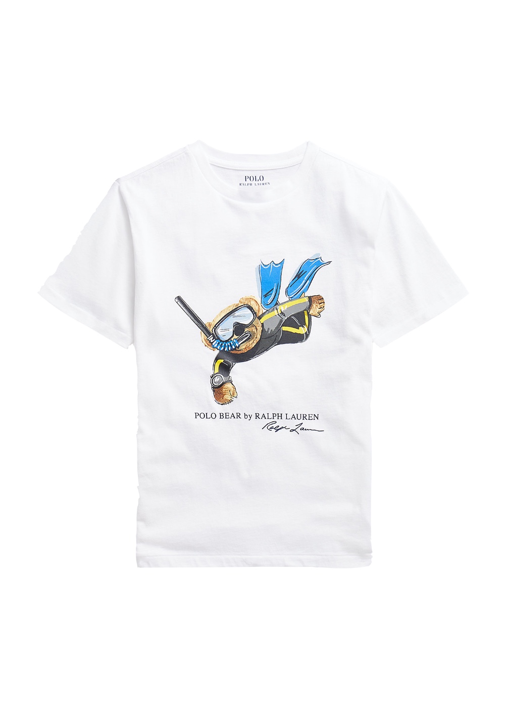 T-shirt girocollo con l’iconico Orso impegnato in un’immersione. Un must have dell’estate! DETTAGLI: Cotone Lavabile in lavatrice Girocollo Maniche corte Polo Bear e scritte “”Polo Bear by Ralph Lauren”” e “”Ralph Lauren”” stampati al centro sul davanti Lunghezza media Vestibilitร comoda