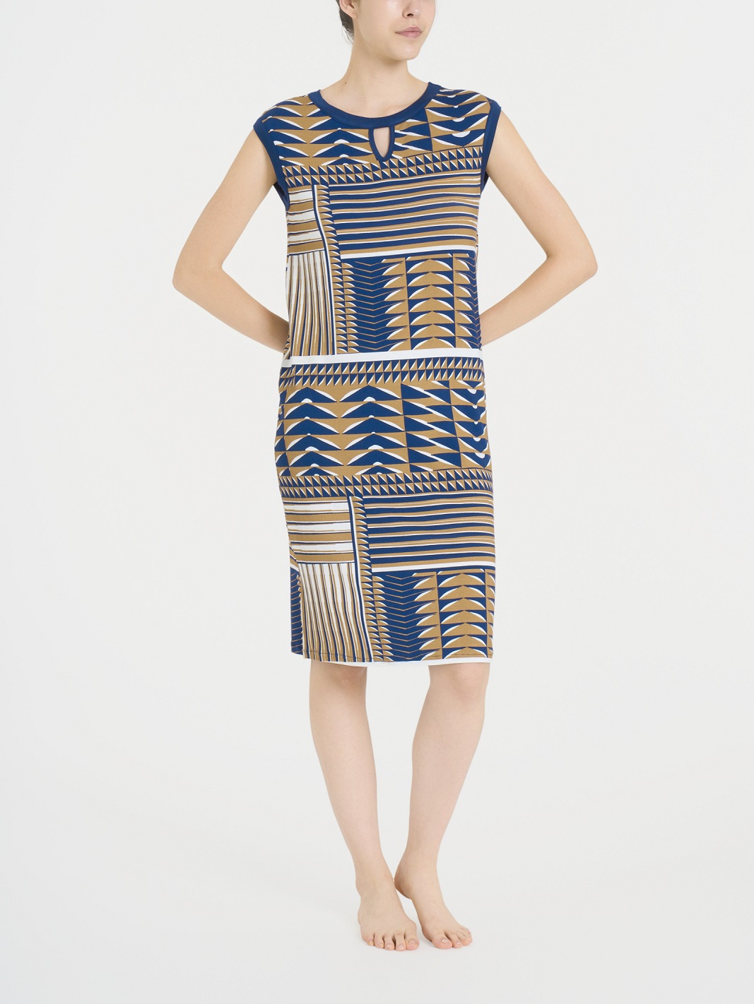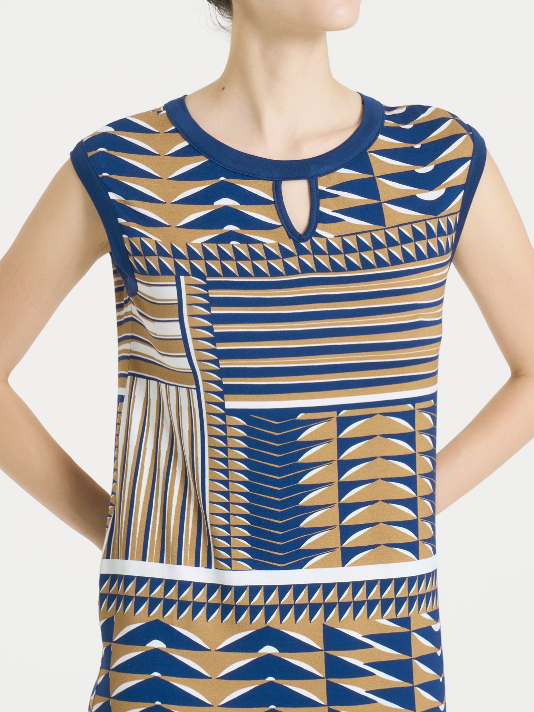 Abito smanicato da donna in jersey di viscosa elasticizzata con fantasia geometrica astratta. Linea dritta e scollo a goccia per un look moderno, fluido e leggero. Un capo della collezione Beachwear RAGNO perfetto per lโ€™estate.