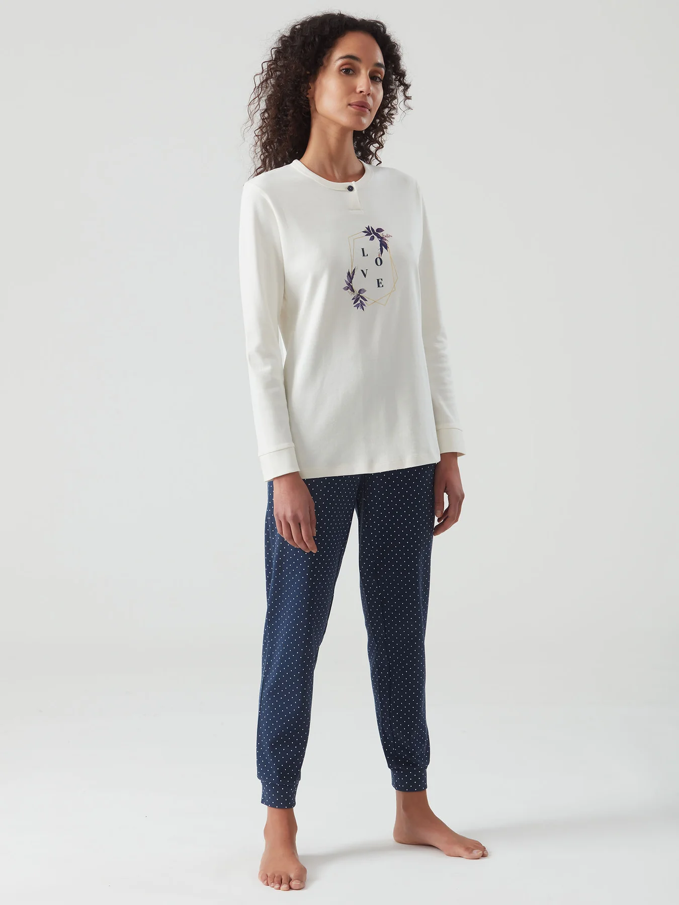 Il Pigiama a serafino “Love” in caldo cotone donna รจ realizzato con la massima attenzione alla vestibilitร . Grazie ai polsini su polsi e caviglie, e il collo a serafino con bottoni, il capo รจ pratico e versatile anche come homewear. Ideale per i periodi piรน freddi dell’anno, con la stampa centrale “Love” tra fiori e forma geometrica, denota uno stile ricercato e spensierato. Il pigiama รจ composto dalla giacca a serafino in tinta unita con polsini e toppe in fantasia applicate sui gomiti. Il Pantalone รจ in fantasia a pois con polsini alla caviglia per una maggiore praticitร .