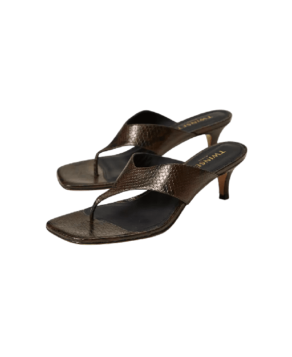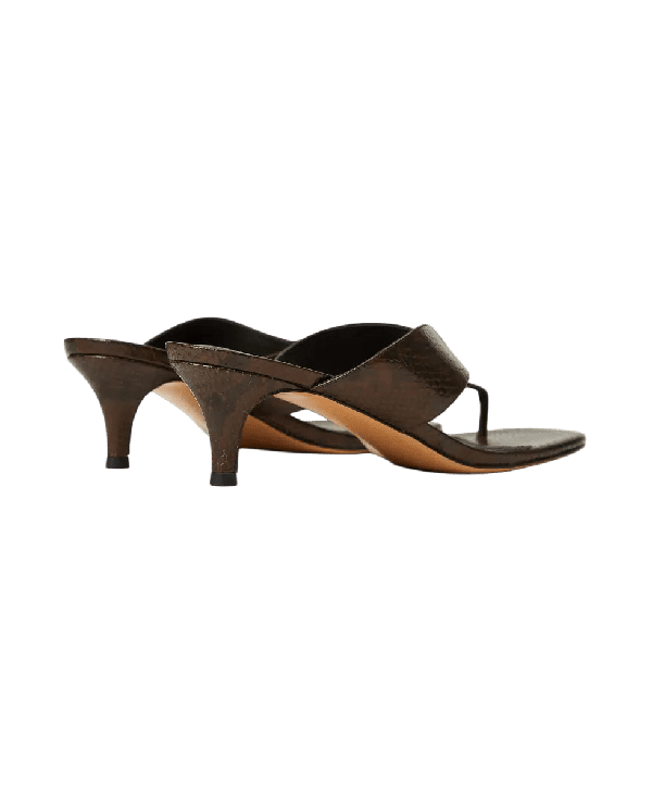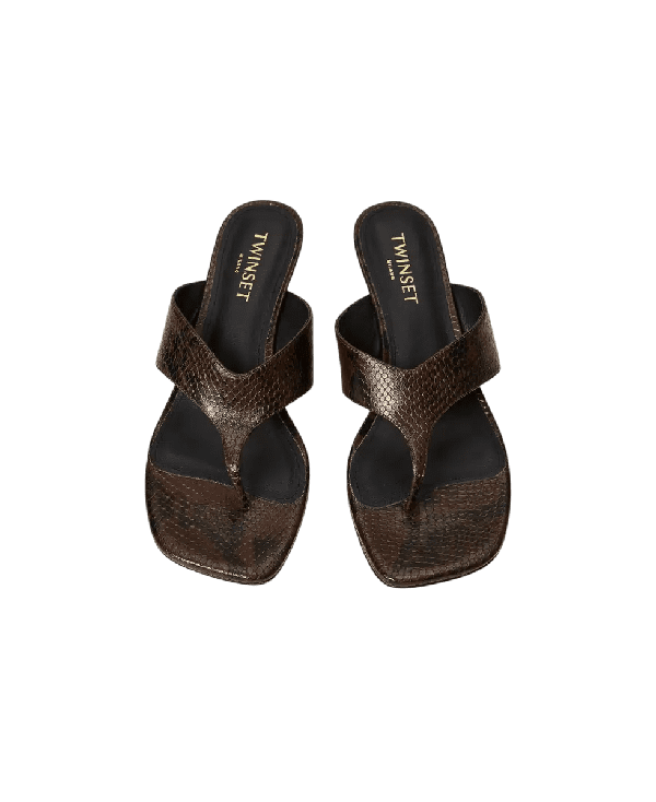 Sandali mules infradito in pelle firmato Twinset Sandali mules infradito in pelle firmato Twinset Codice prodotto:ย 251TGT172;ย Pitone Chocolate; Altezza tacco 6 cm; 100% pelle bovina. Fodera: 100% pelle bovina. Soletta: 100% capra domestica. Suola: 100% gomma.