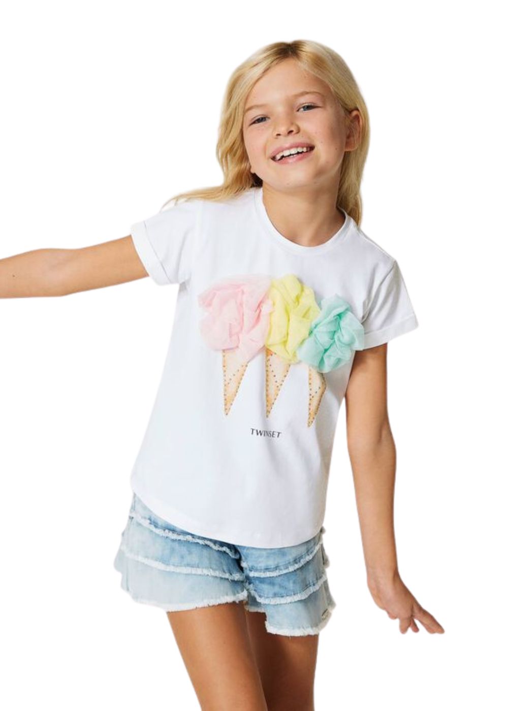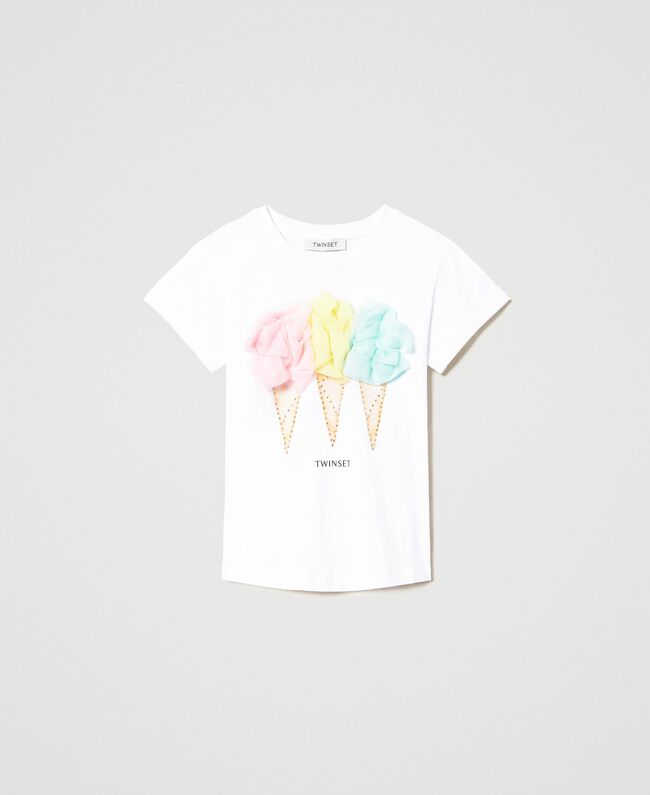 Divertente e ricercata la T-shirt da bambina in jersey di cotone stretch, con stampa gelati ad acqua e applicazioni di tulle. Collo tondo, maniche corte con risvolto cucito e logo. Perfetta con denim e giacca chiodo.