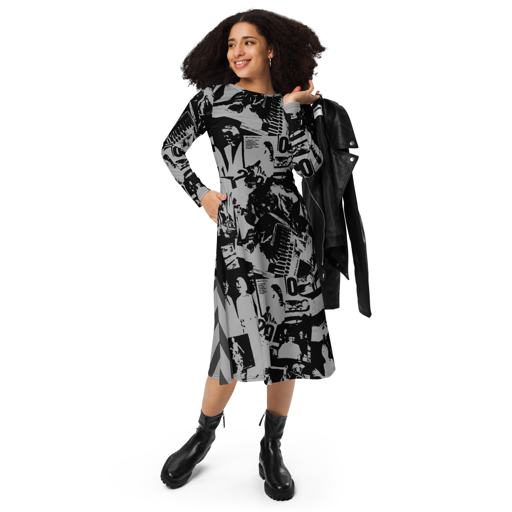 Vestito midi a maniche lunghe con stampa all over
