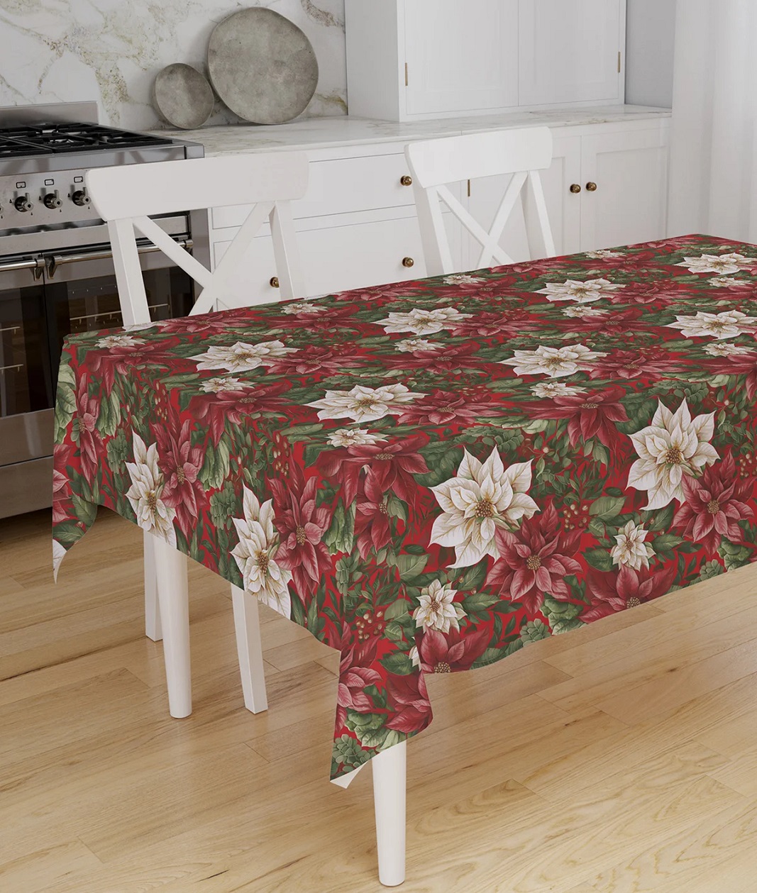 Il decoro è dominato da un’esplosione di stelle di Natale rosse e bianche, armoniosamente accompagnate da foglie verdi su fondo rosso. Un mix perfetto per chi desidera un’atmosfera festosa, calda e accogliente.