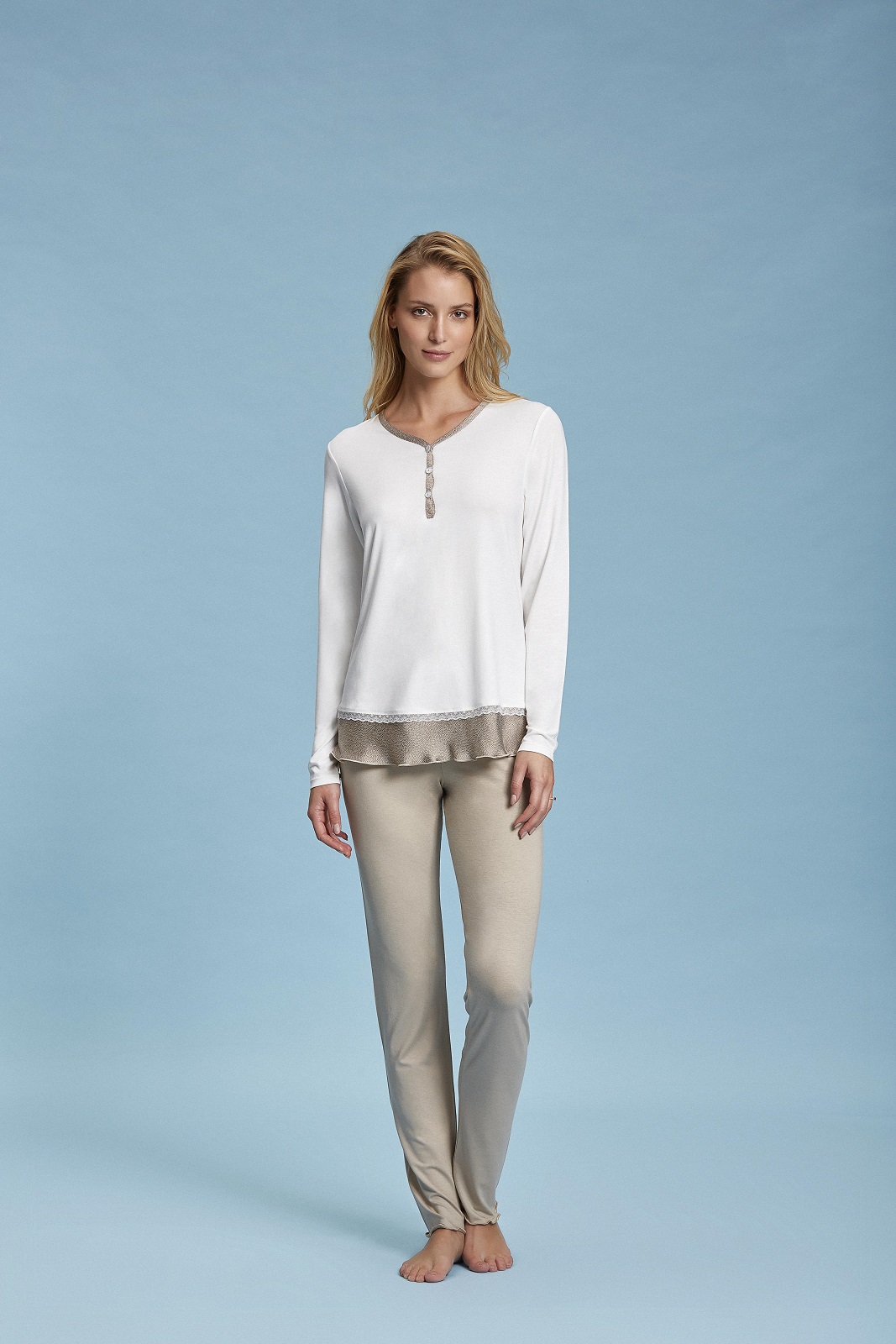 Il Pigiama Donna Manica Lunga Con Inserti In Raso fa parte della collezione del brand ANDRA.
