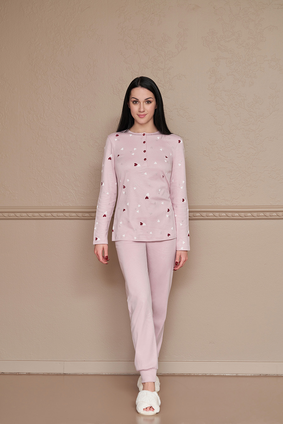 Il Pigiama a serafino con manica lunga e cuoricini della linea Bee Cool è un pigiama romantico e giovanile. Il collo è a serafino con bottoni e stampa a cuoricini. Il pantalone è in tinta unita con polsini per donare maggiore confort. Ideale per le ragazze e le donne giovani dallo stile spensierato. Disponibile nei colori rosa chiaro e marlin.
